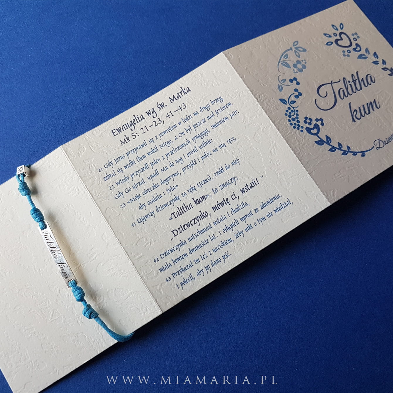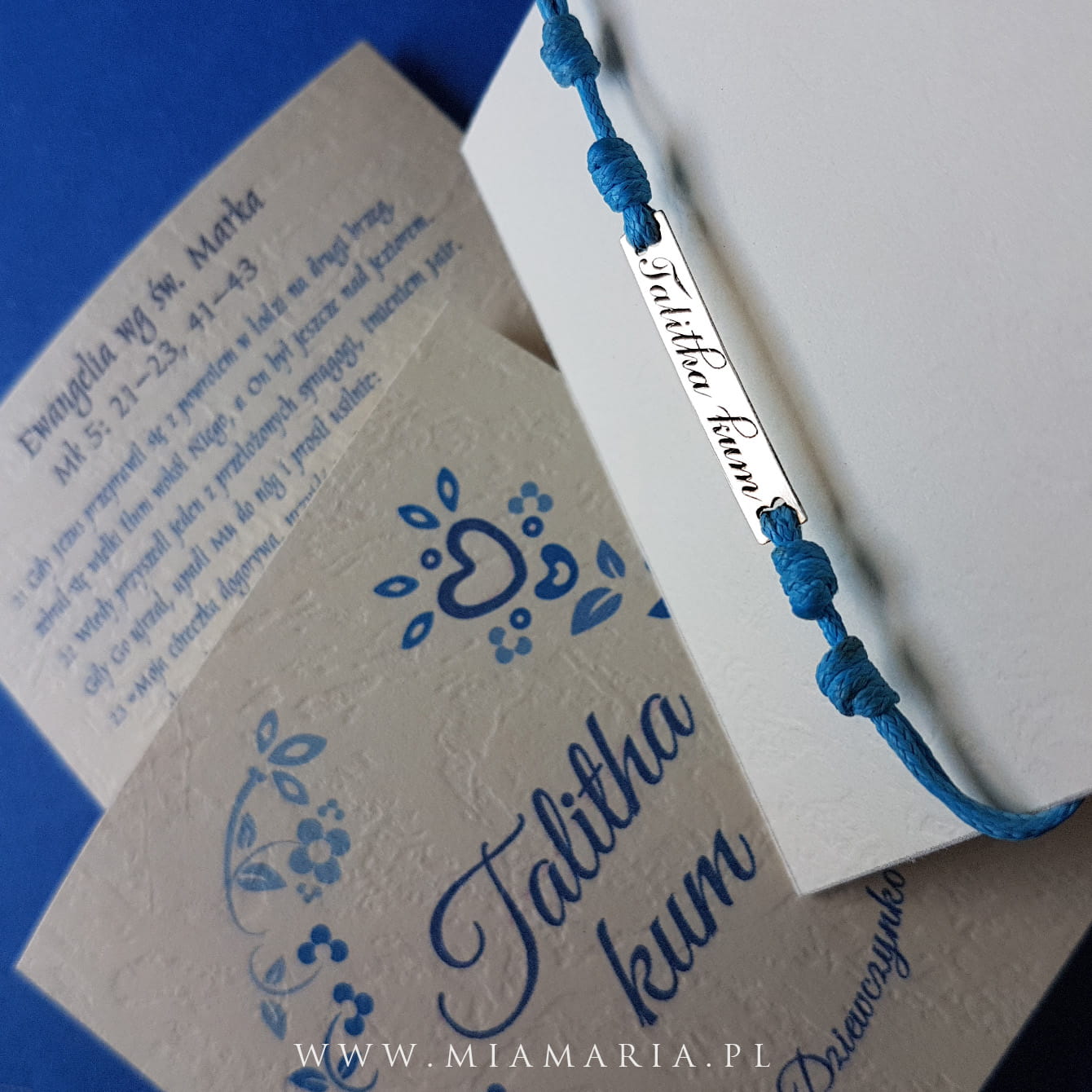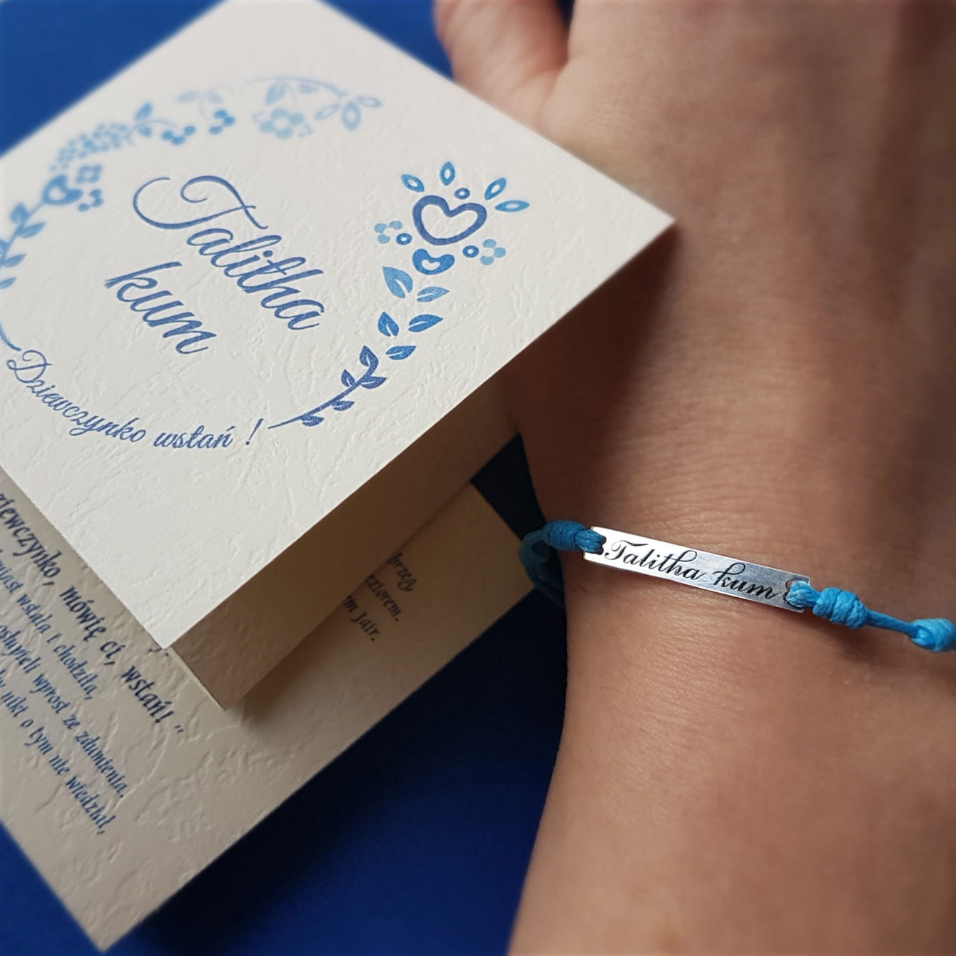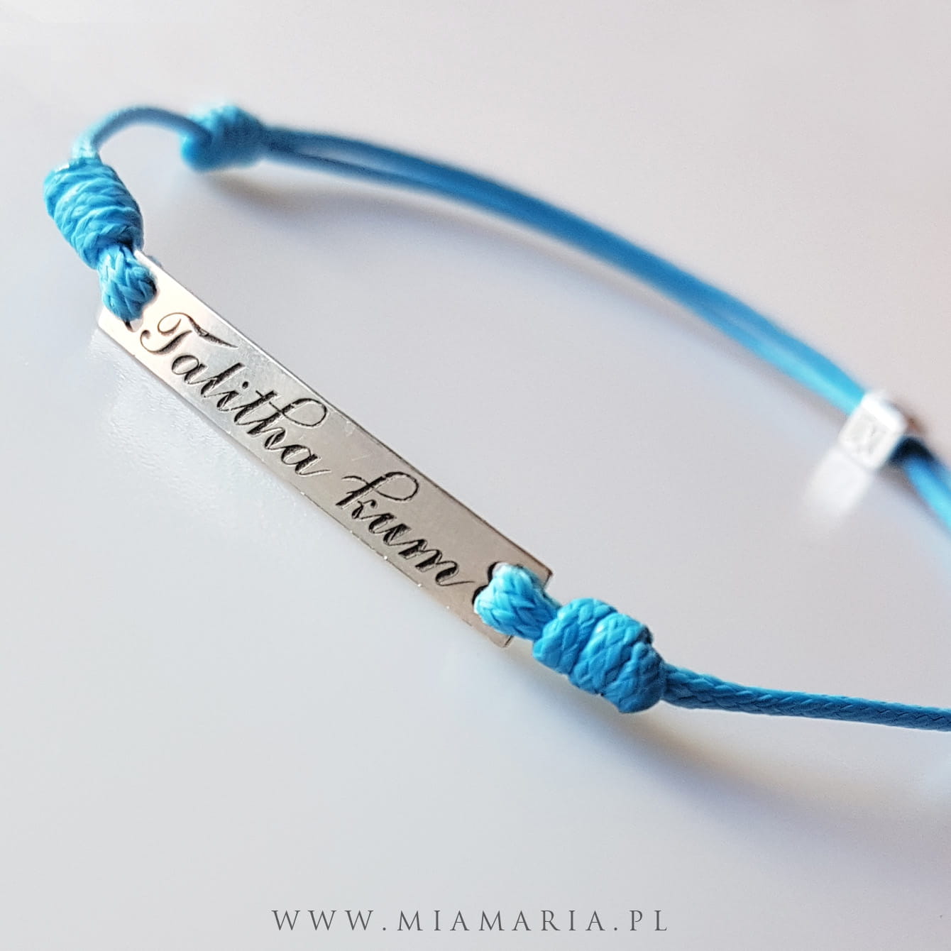 Bransoletka ze srebrną blaszką „Talitha Kum”.