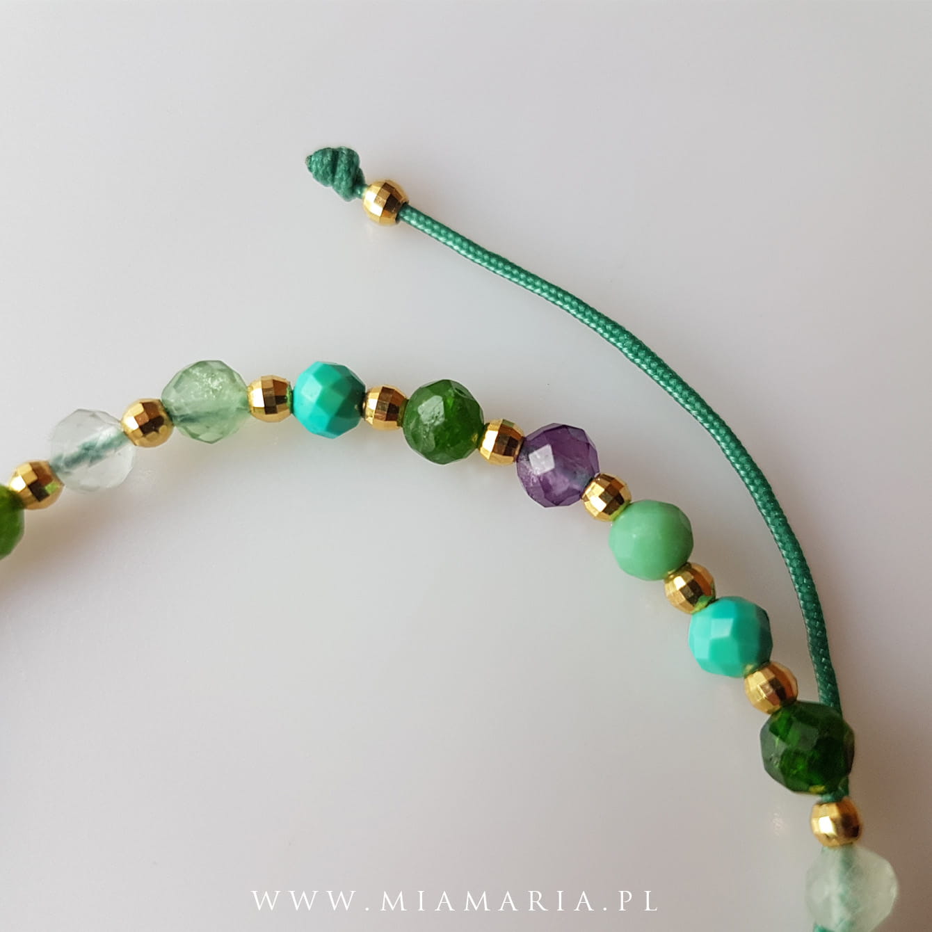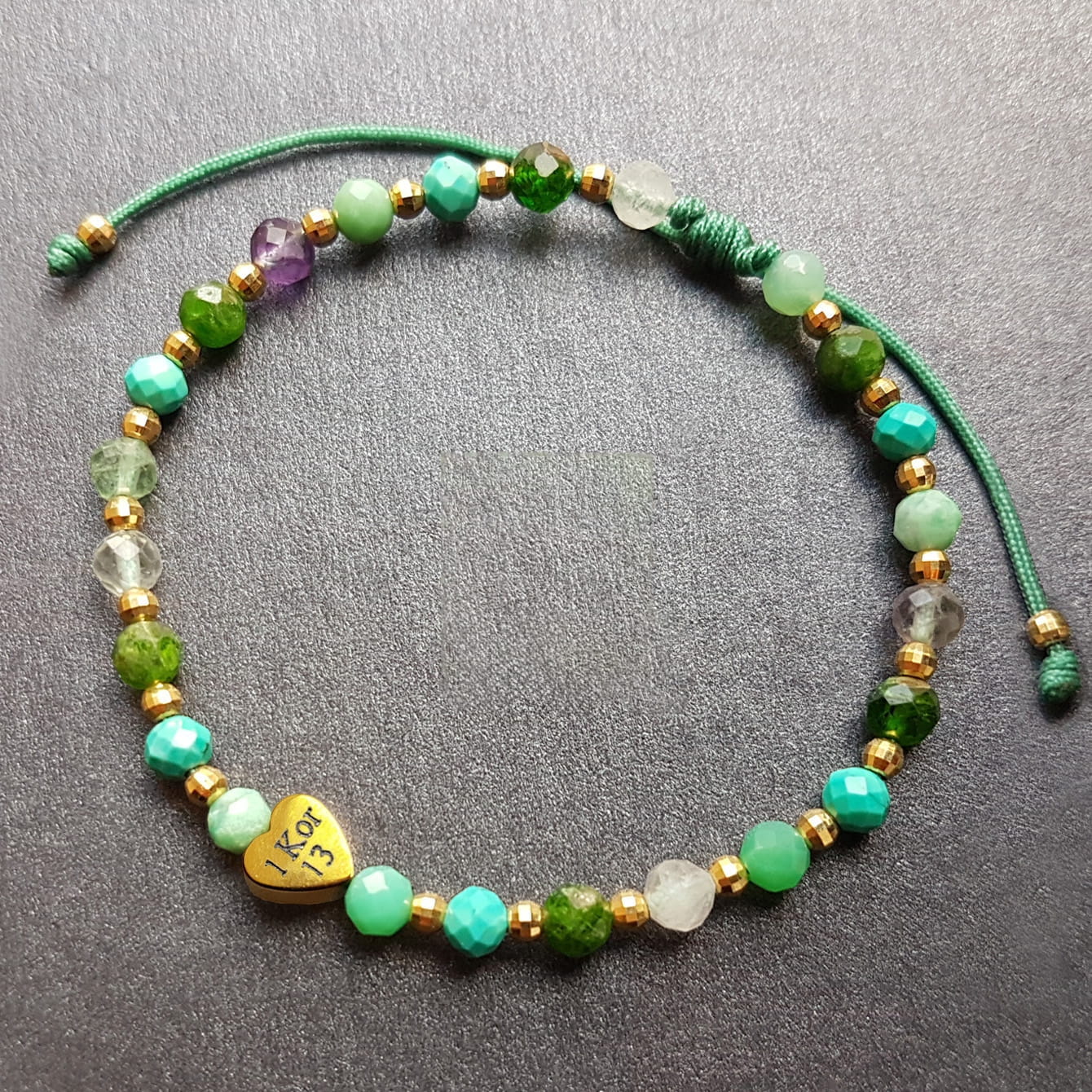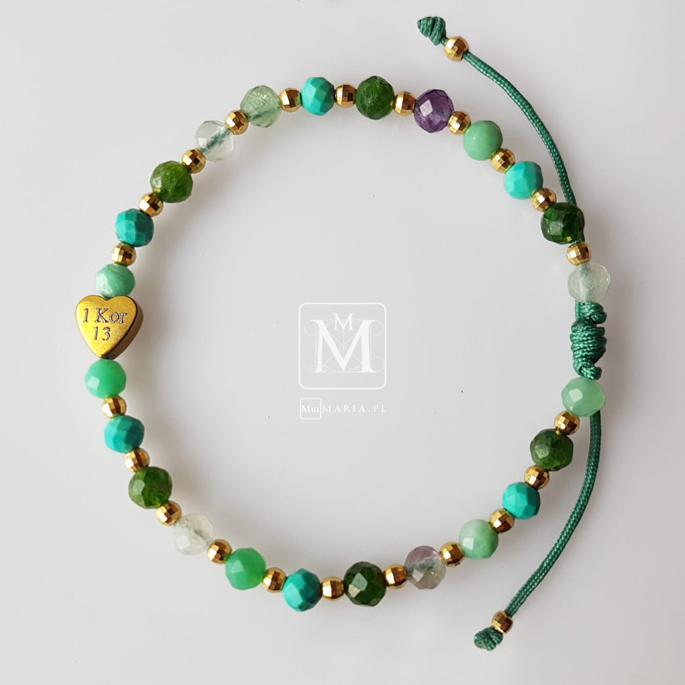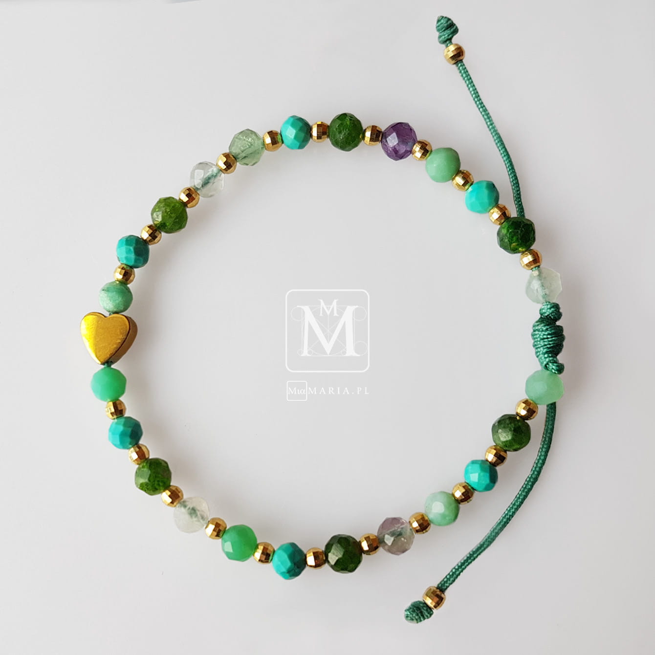 Materiał: Serduszko ze złotym hematytem (6x6 mm), hematyt w kolorze złota ( fasetowane kulki 3mm),fasetowane kamienie w odcieniach zieleni (4 mm), sznurek jubilerski, kosteczki z hematytu.