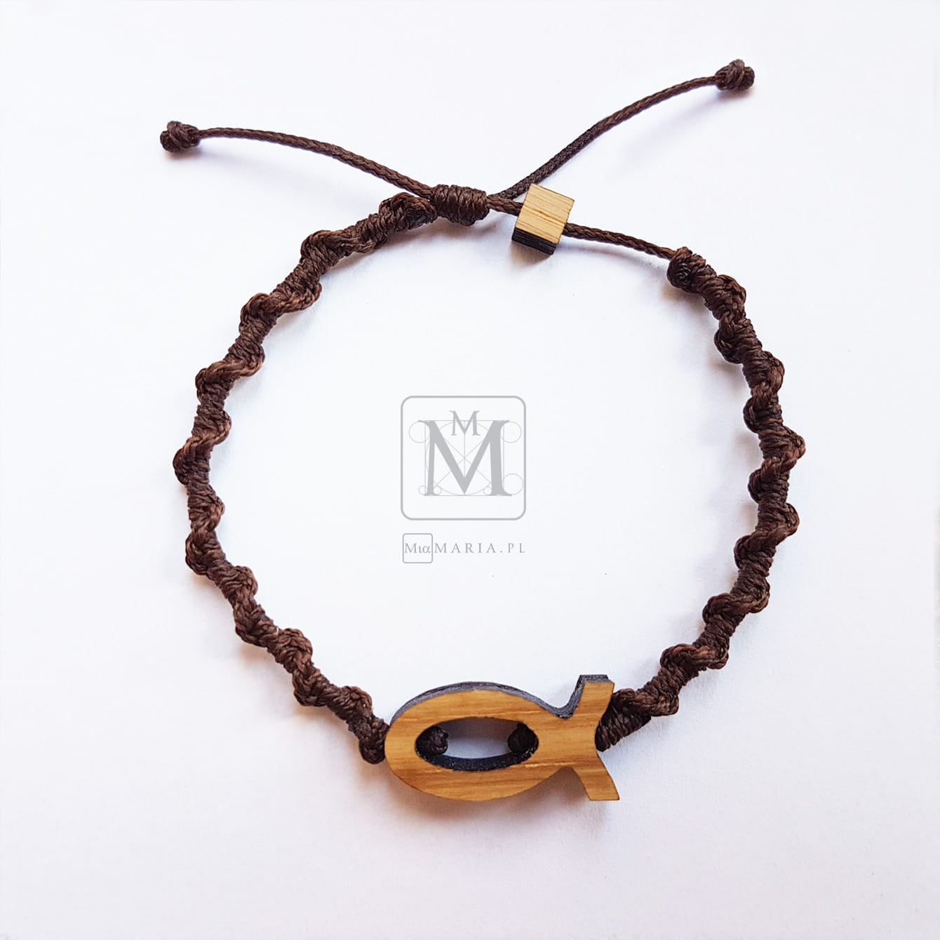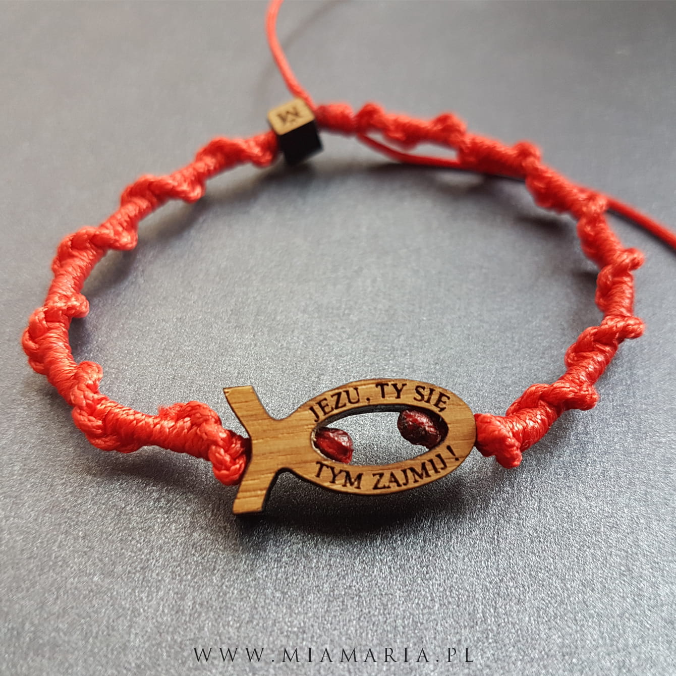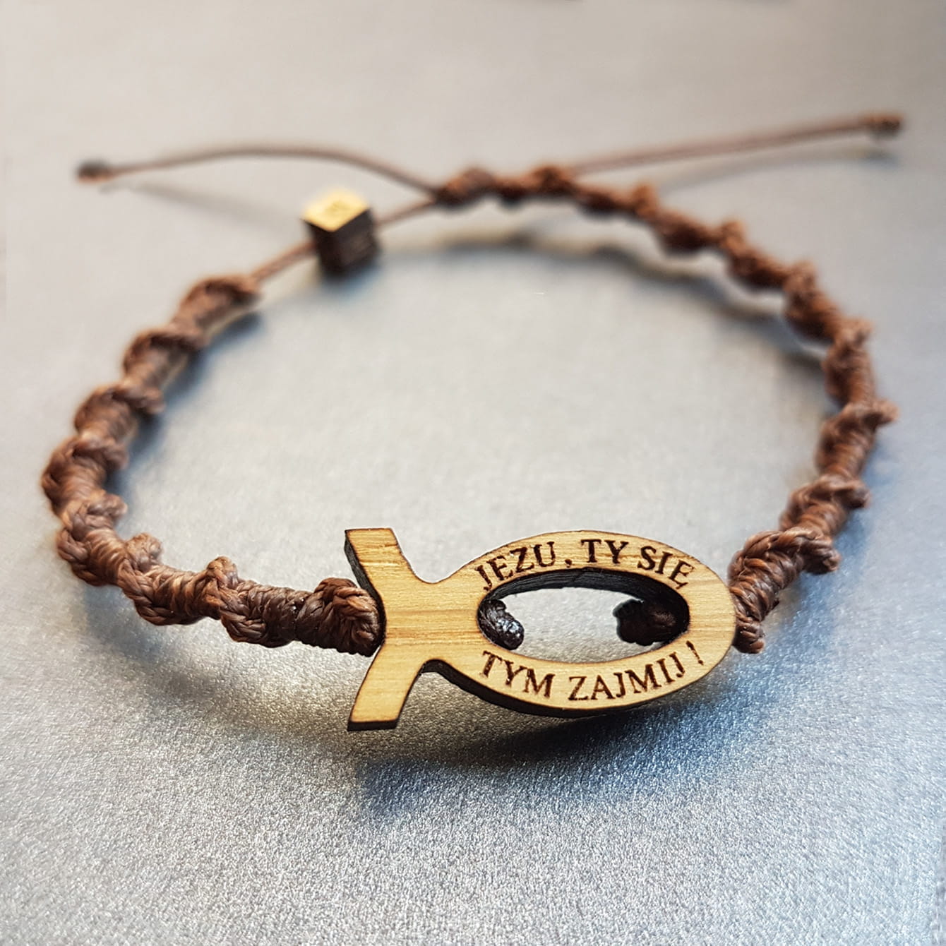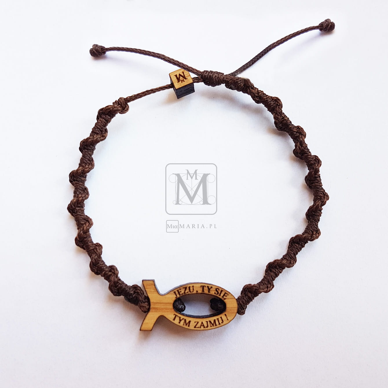 Bransoletka z drewnianą rybą i cytatem modlitwy o. Dolindo Ruotolo: ' Jezu, Ty się tym zajmij ! '.