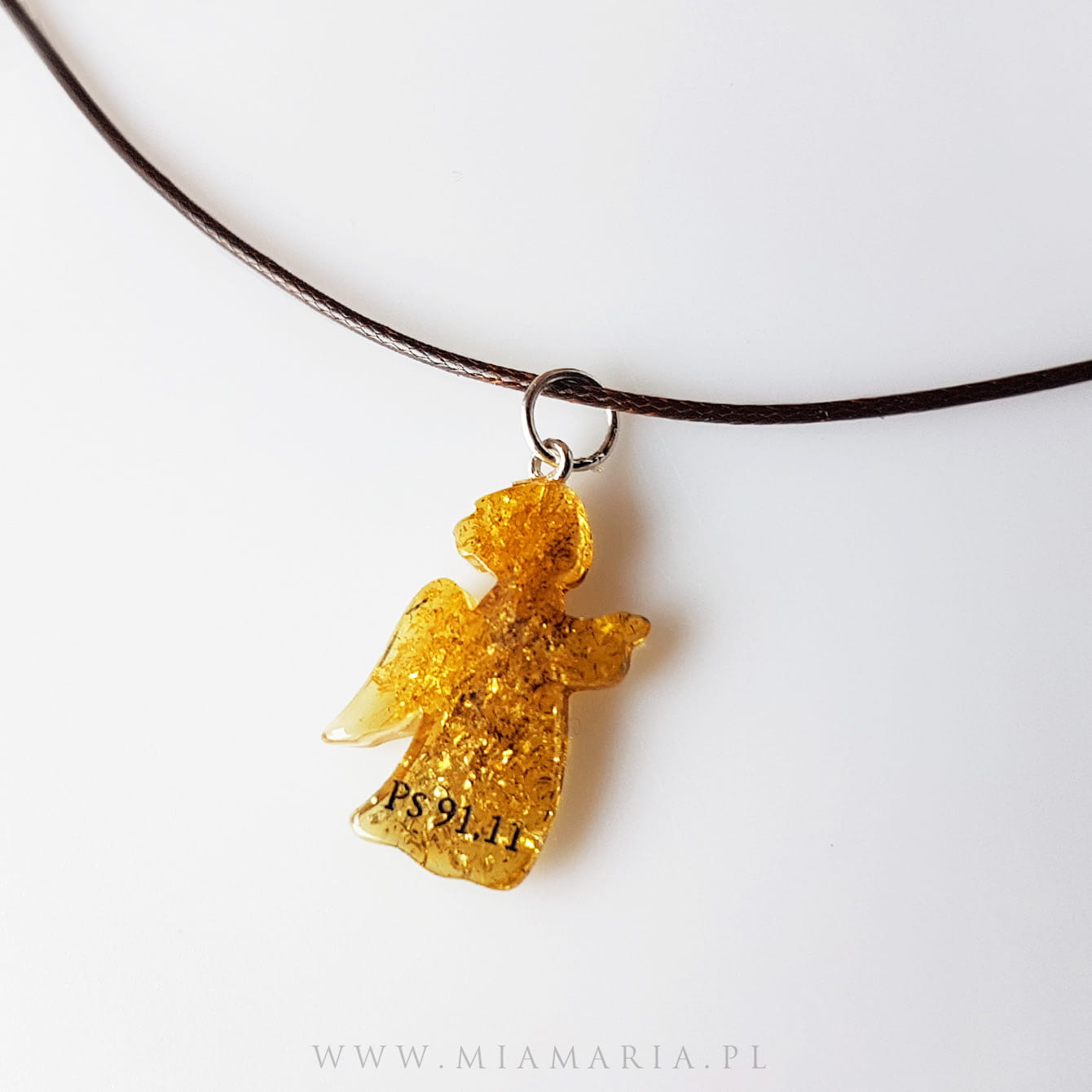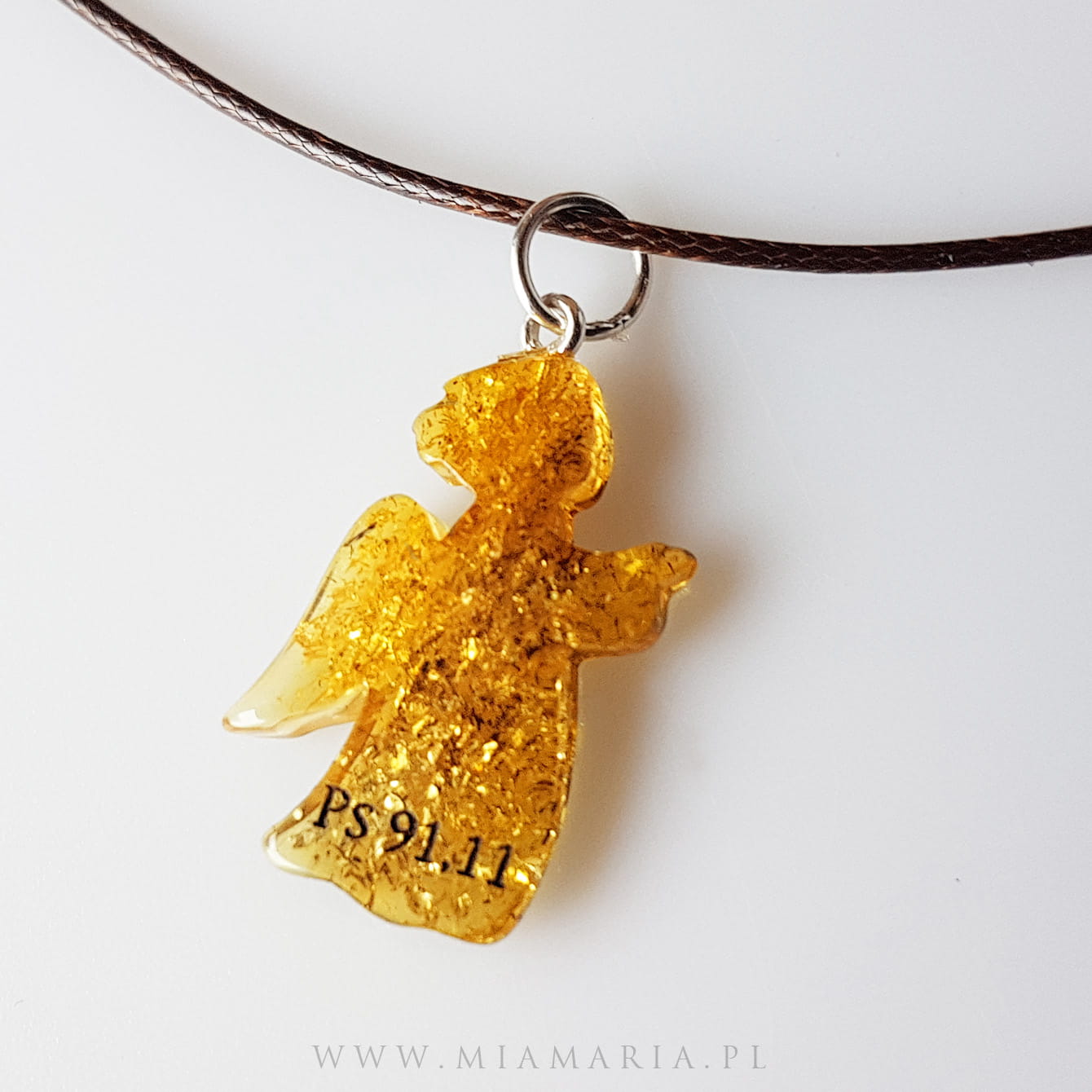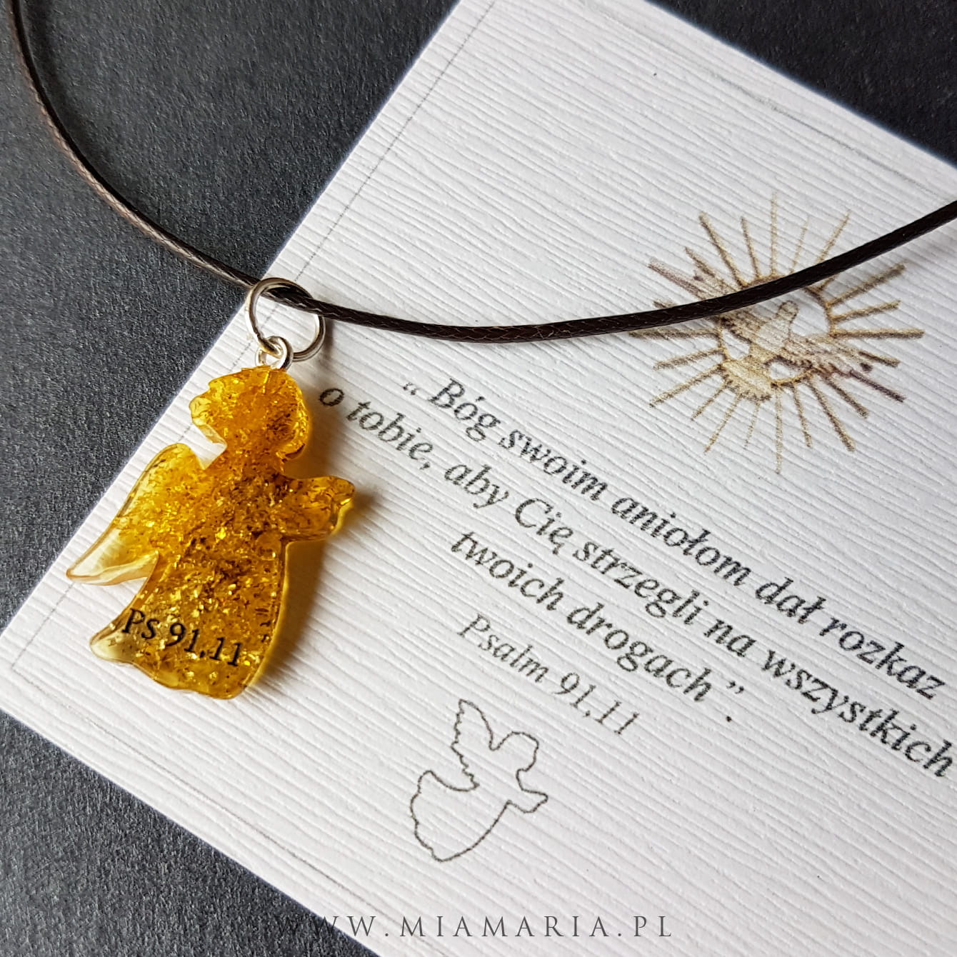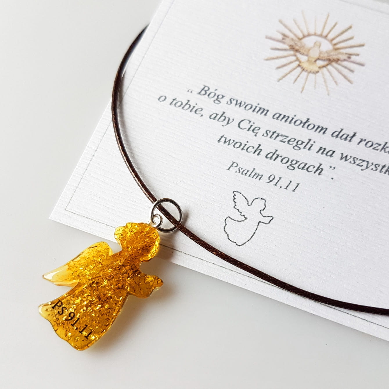 Naszyjnik z aniołkiem z bursztynu i symbolem biblijnym Ps 91,11