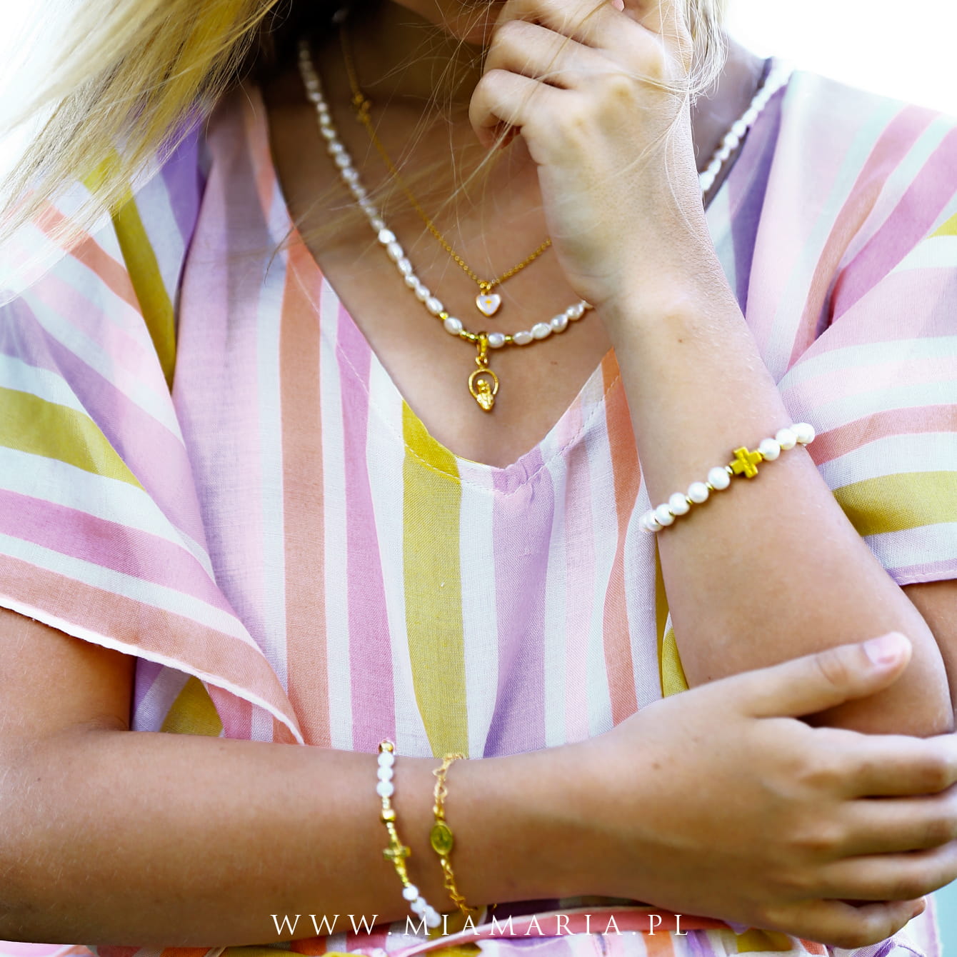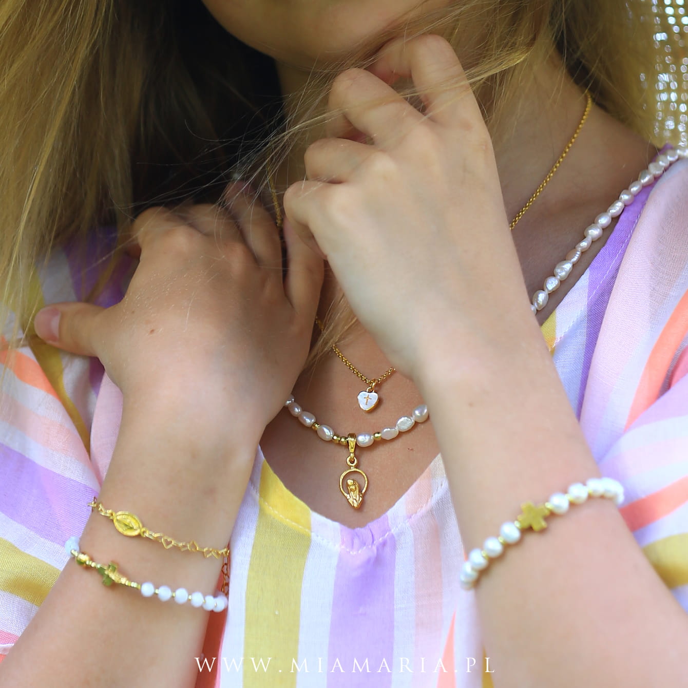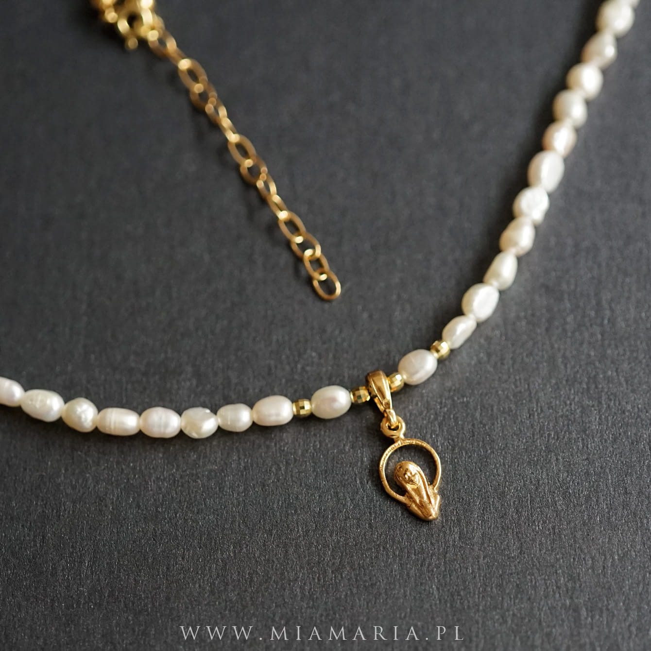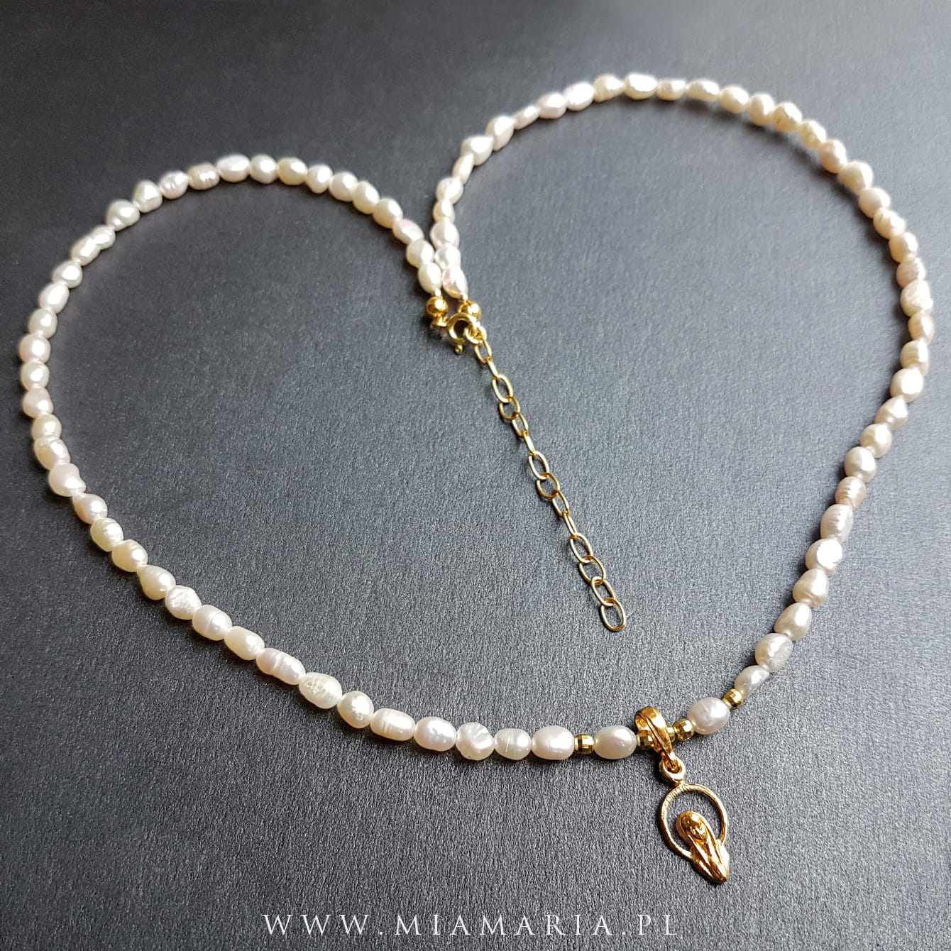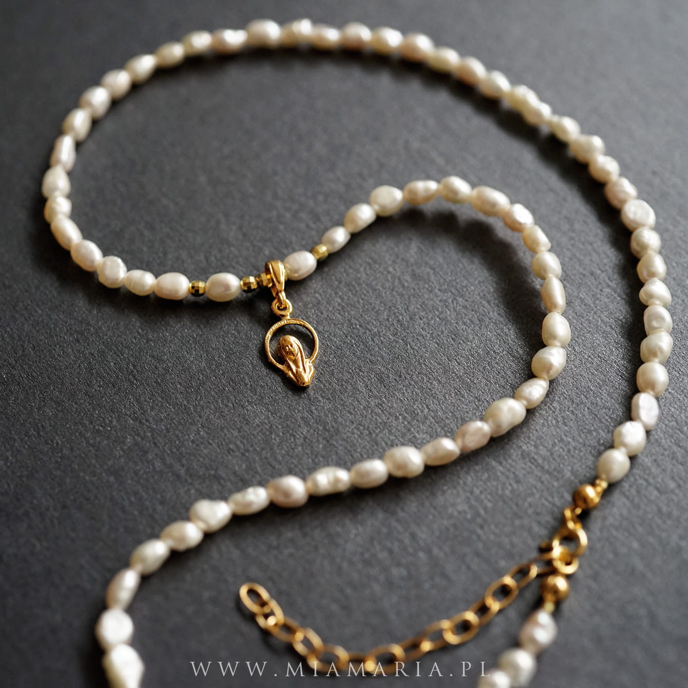 Pozłacane srebro próby 925 (bez domieszki niklu) (zawieszka z MB, łańcuszek, zapięcie, drobny imiennik Mia Maria), nieregularne perły ok.4x6 mm
