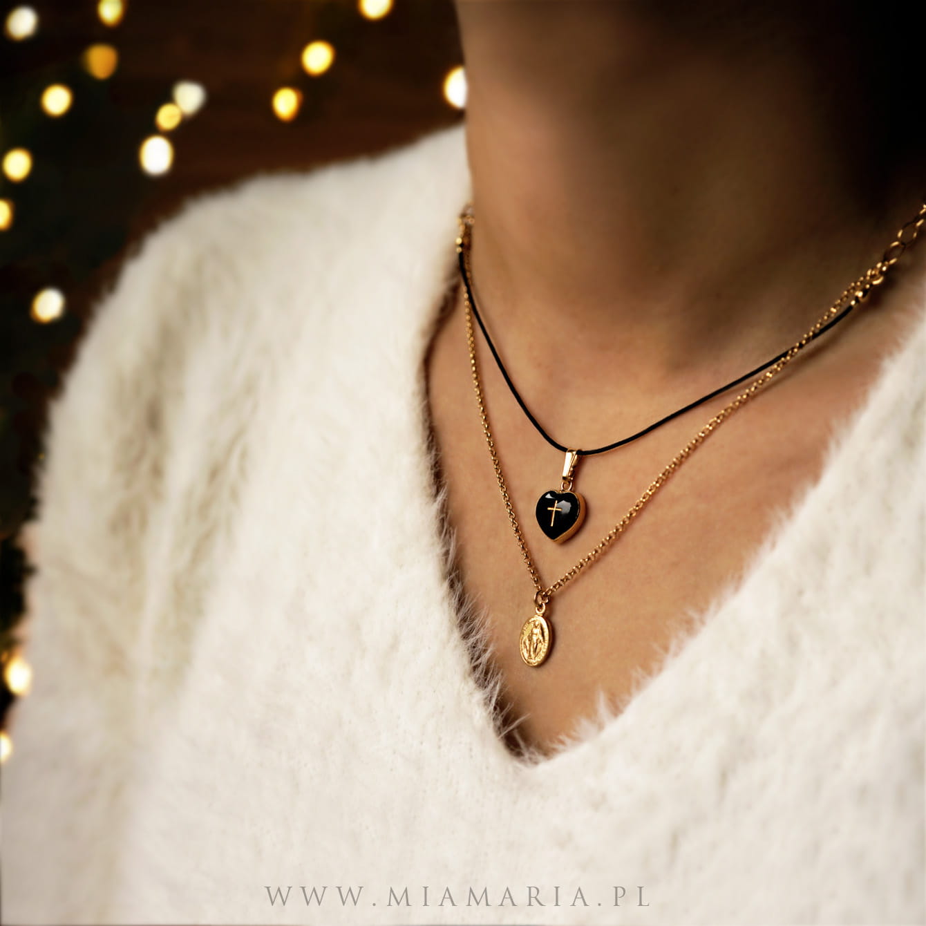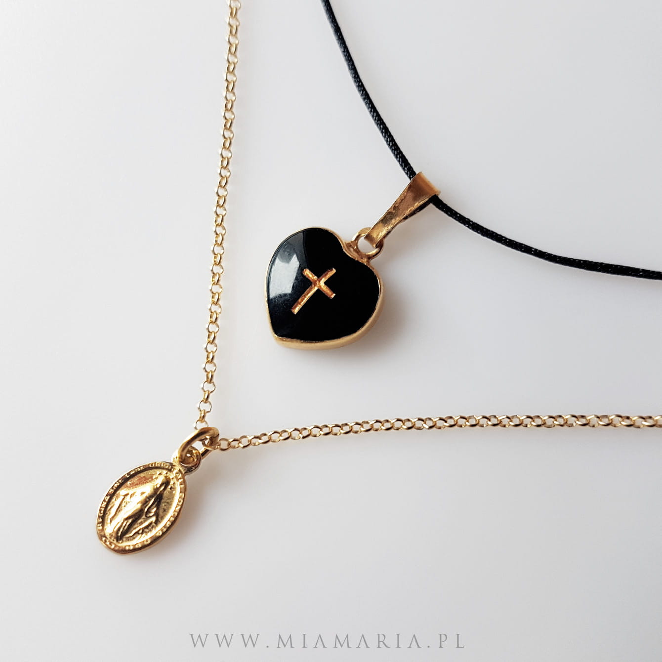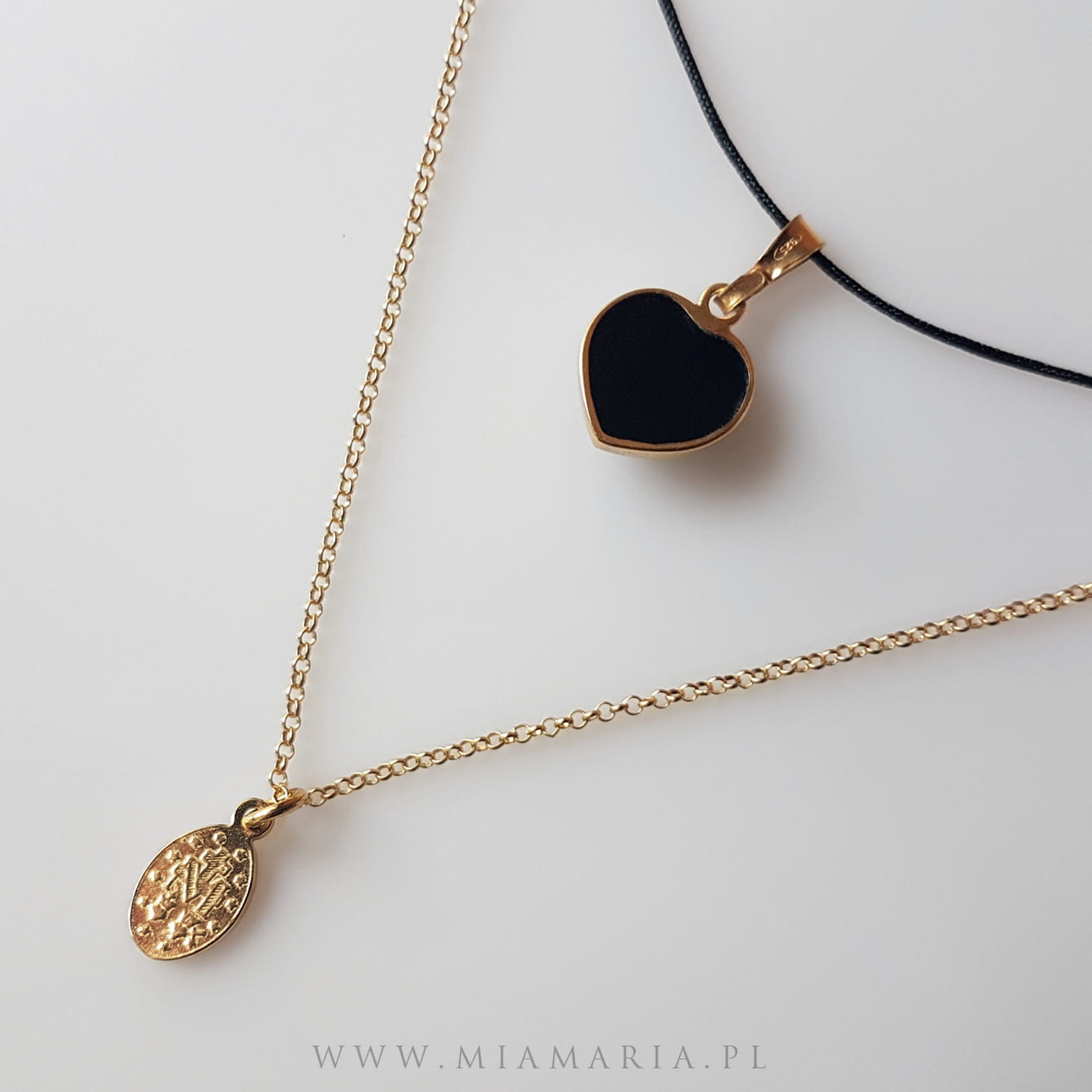 Srebro pozłacane próby 925 (bez domieszki niklu) (zawieszka, ramka, drobny imiennik Mia Maria, Cudowny medalik 9x6 mm, łańcuszek), masa perłowa (czarne serduszko 12 x 12mm), sznurek jubilerski.