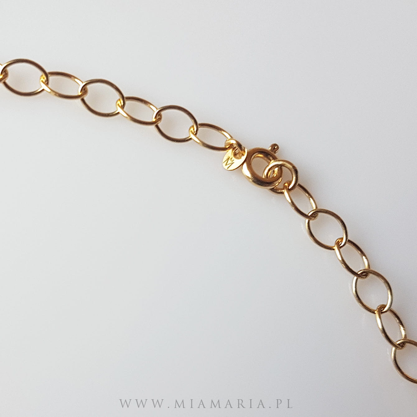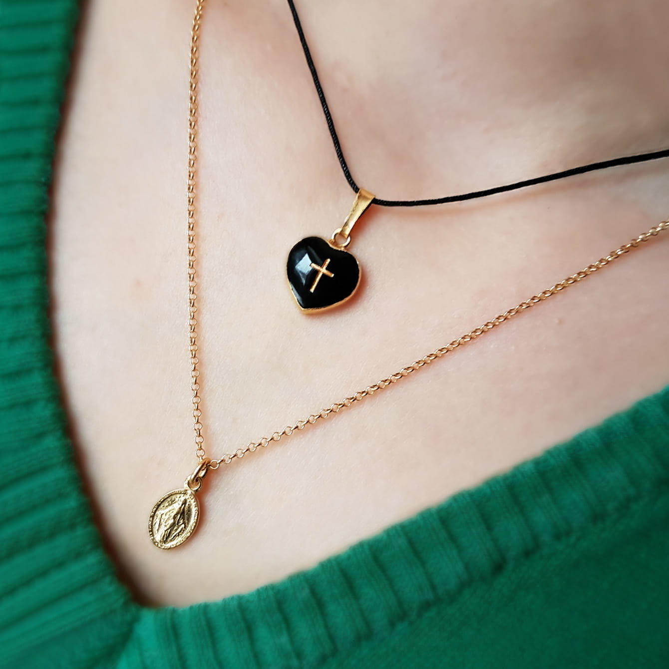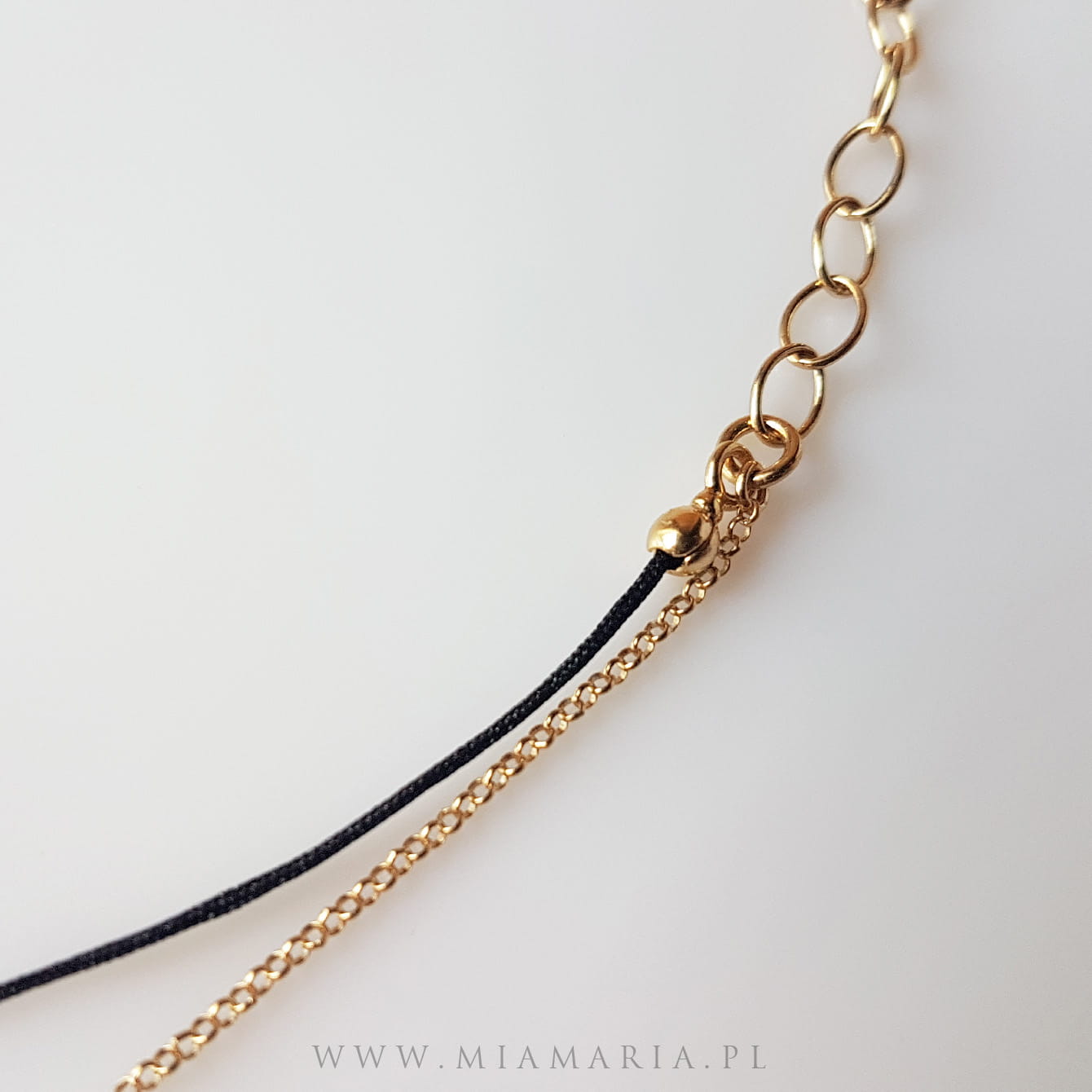 Srebro pozłacane próby 925 (bez domieszki niklu) (zawieszka, ramka, drobny imiennik Mia Maria, Cudowny medalik 9x6 mm, łańcuszek), masa perłowa (czarne serduszko 12 x 12mm), sznurek jubilerski.