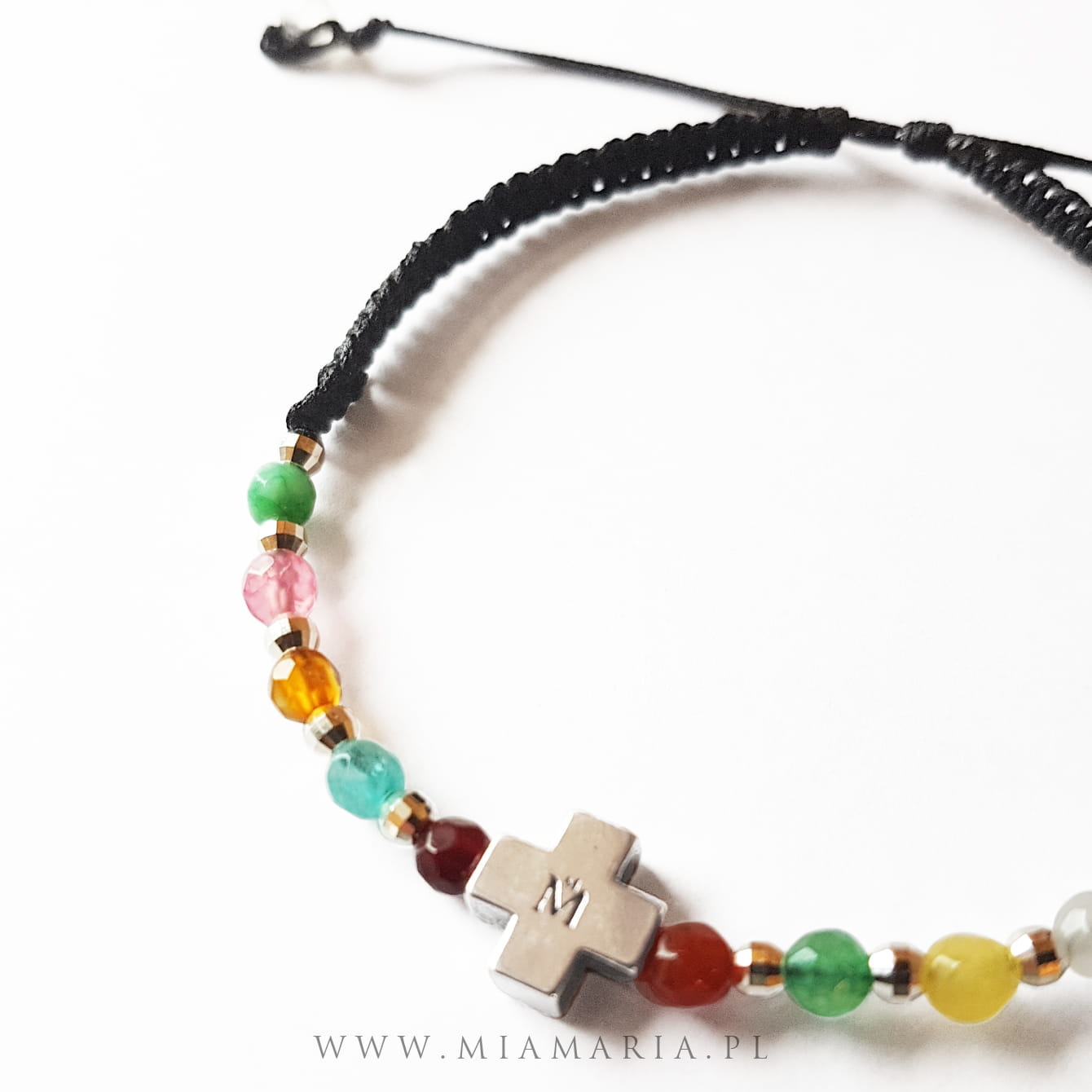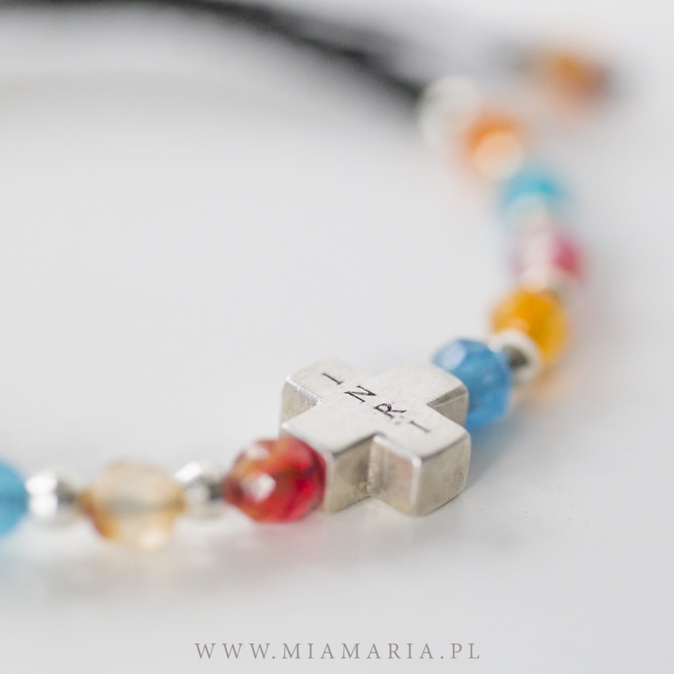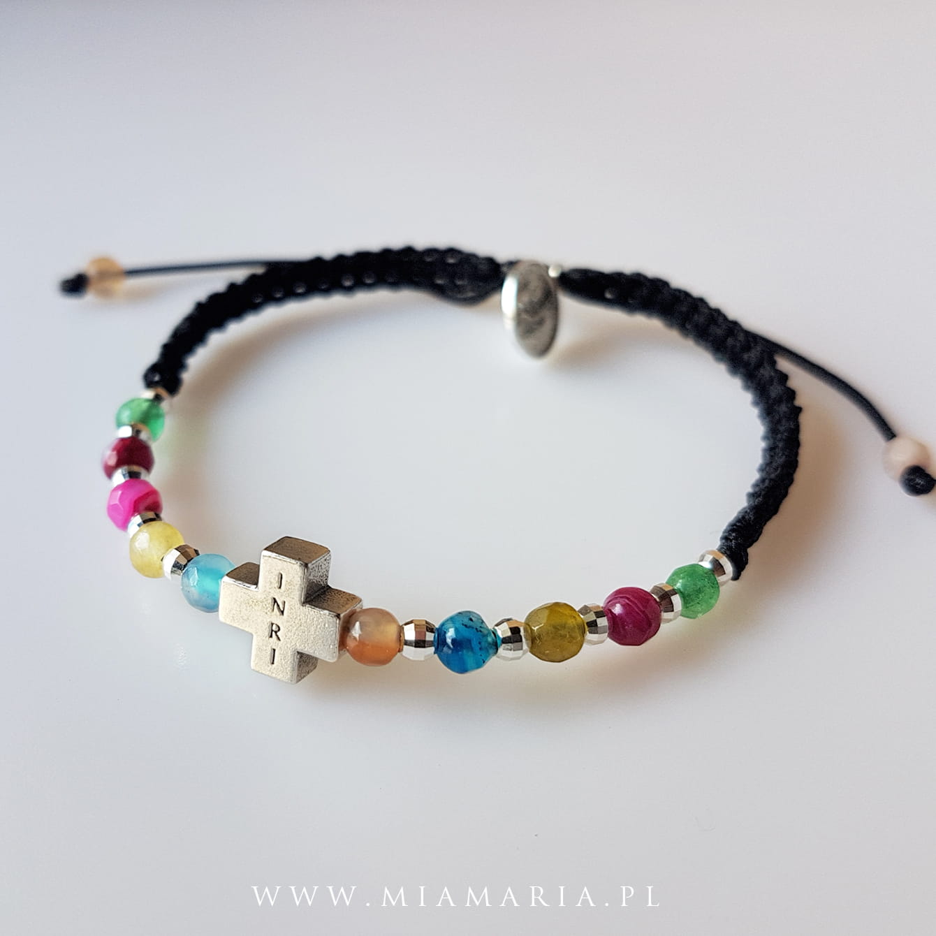 Materiał: Srebro próby 925 (bez domieszki niklu) (Krzyż 9x9x3mm, medalik), fasetowane kulki kulki z hematytu w kolorze srebra 3mm, kamienie wielokolorowego, fasetowanego agatu i jadeitu (4mm), najwyższej jakości sznurek jubilerski w kolorze czarnym