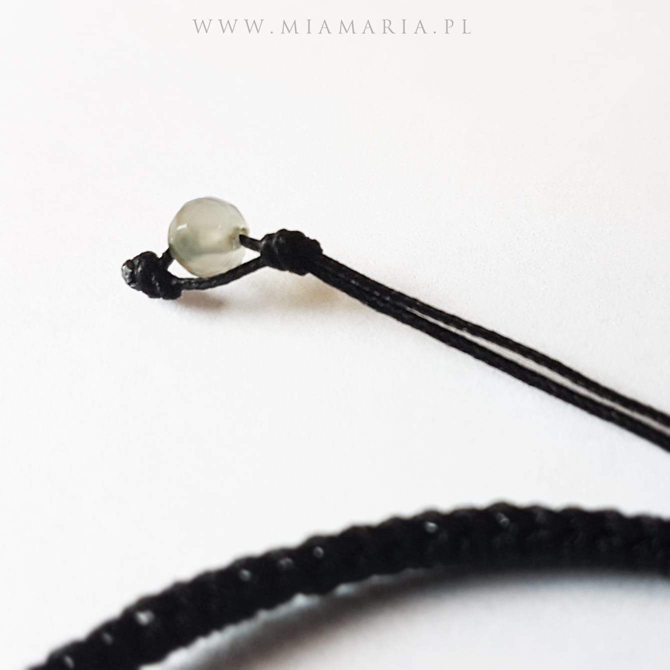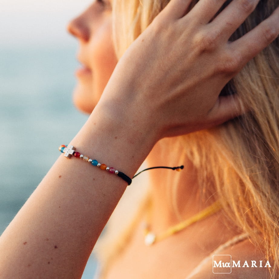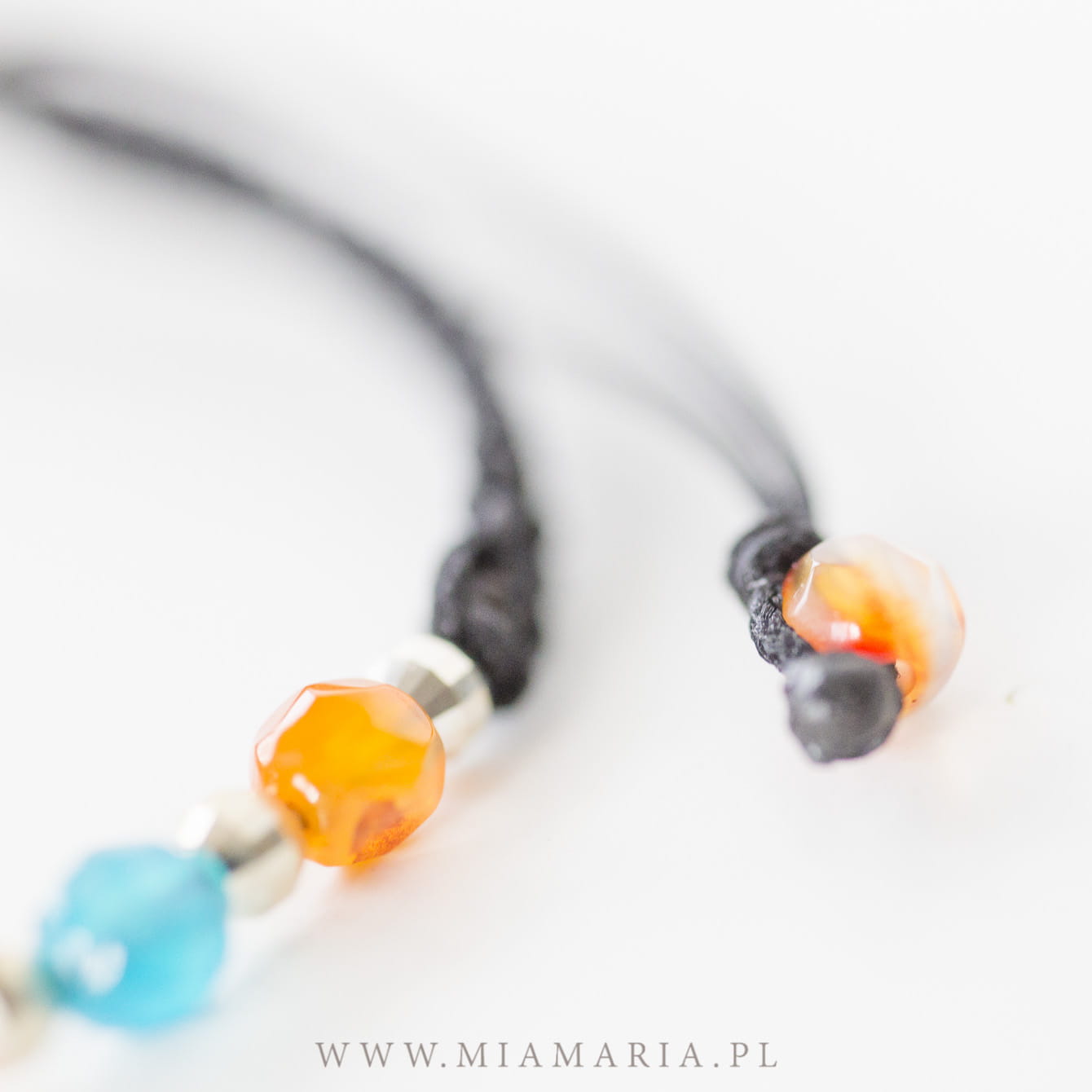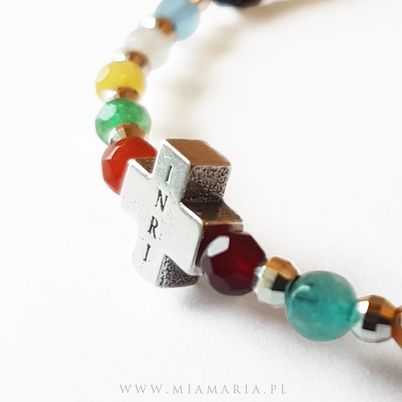 Materiał: Srebro próby 925 (bez domieszki niklu) (Krzyż 9x9x3mm, medalik), fasetowane kulki kulki z hematytu w kolorze srebra 3mm, kamienie wielokolorowego, fasetowanego agatu i jadeitu (4mm), najwyższej jakości sznurek jubilerski w kolorze czarnym