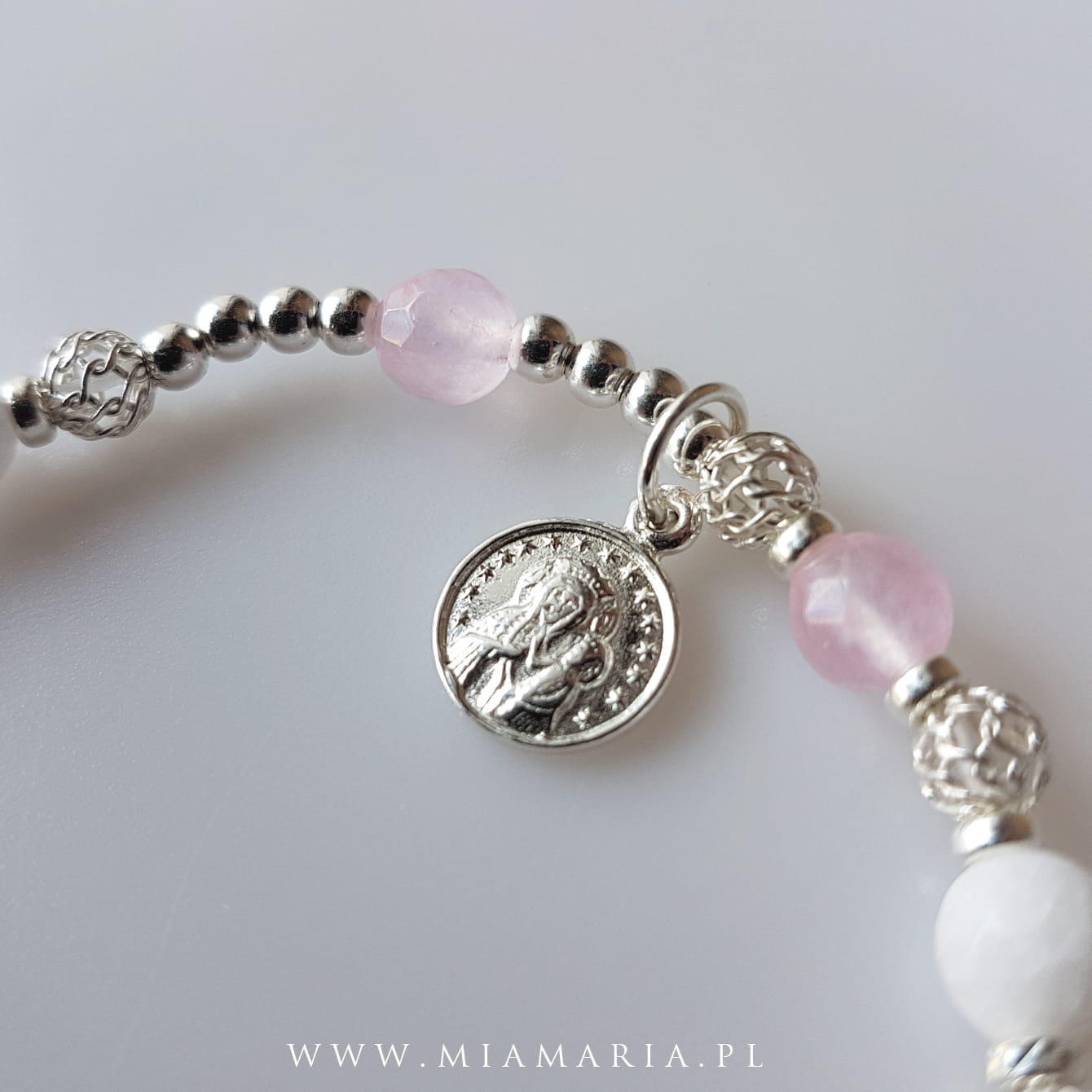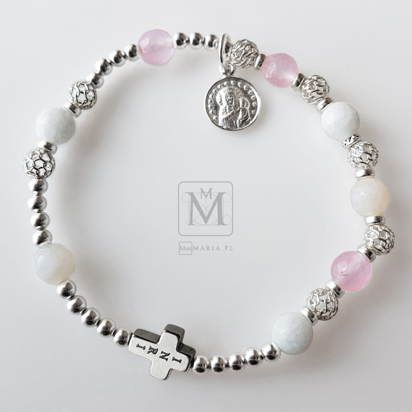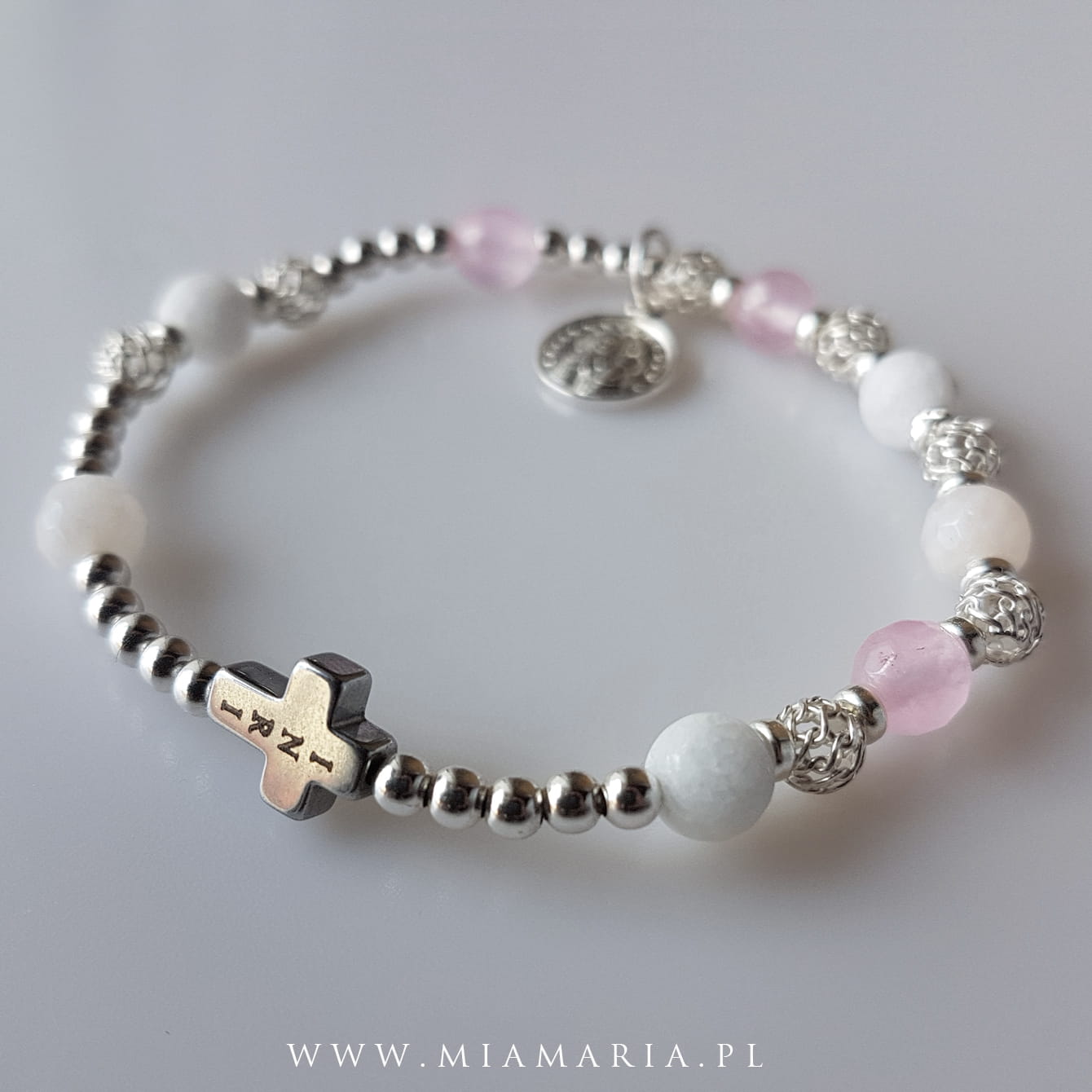 Materiał: Krzyż z hematytu w kolorze srebrnym (10x8 mm), kuleczki z hematytu w kolorze srebra 3mm,srebro próby 925 (bez domieszki niklu) (medalik, srebrne oponki, ażurowe kulki), kamienie z fasetowanego pastelowego jadeitu (6mm), gumka jubilerska.