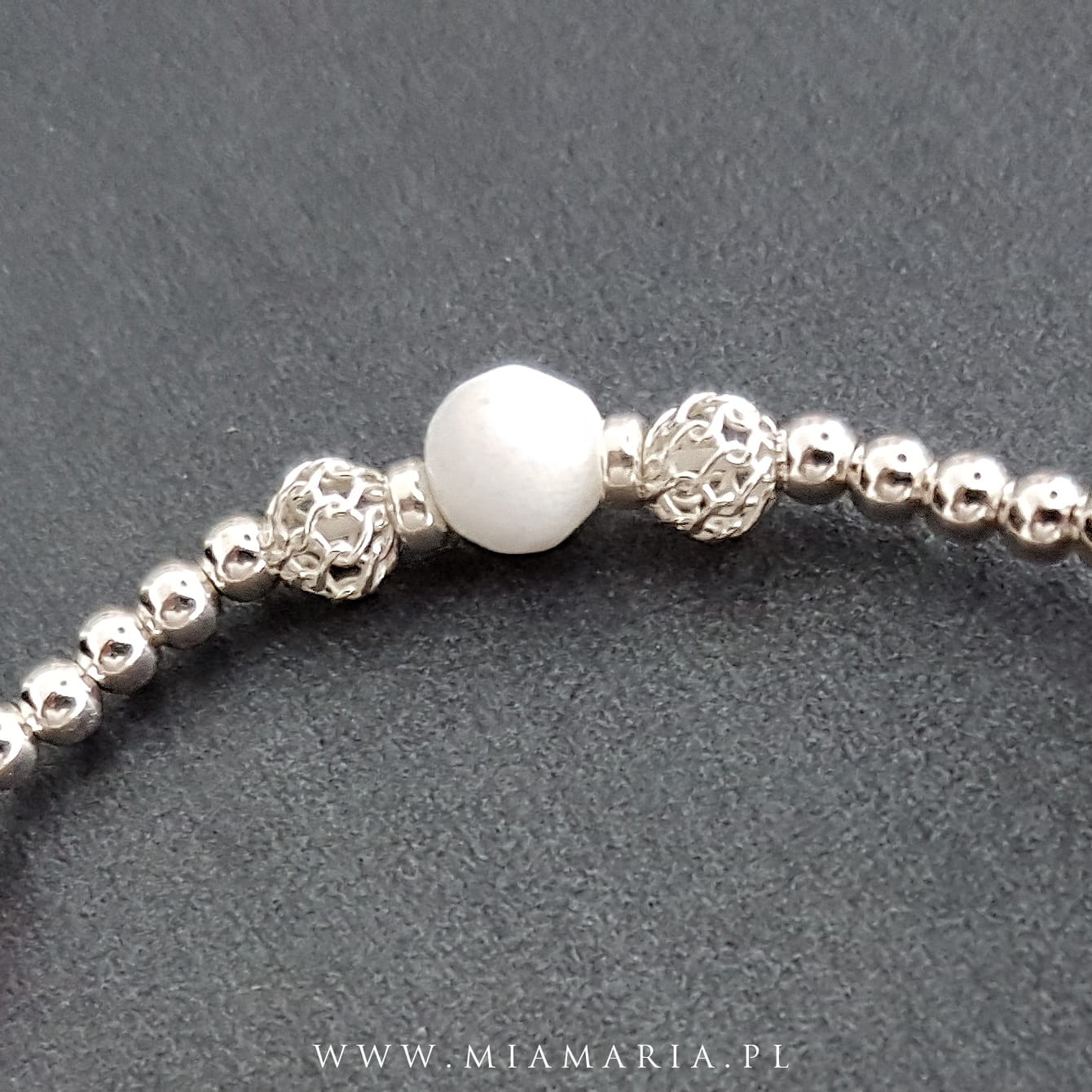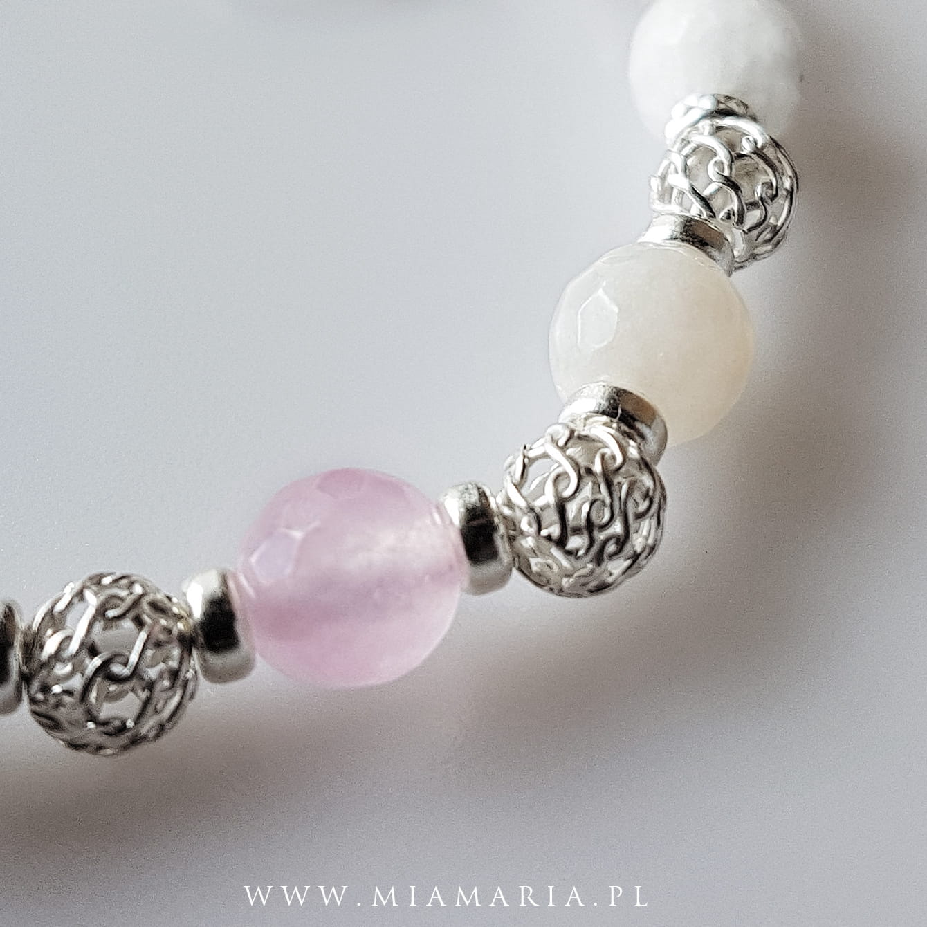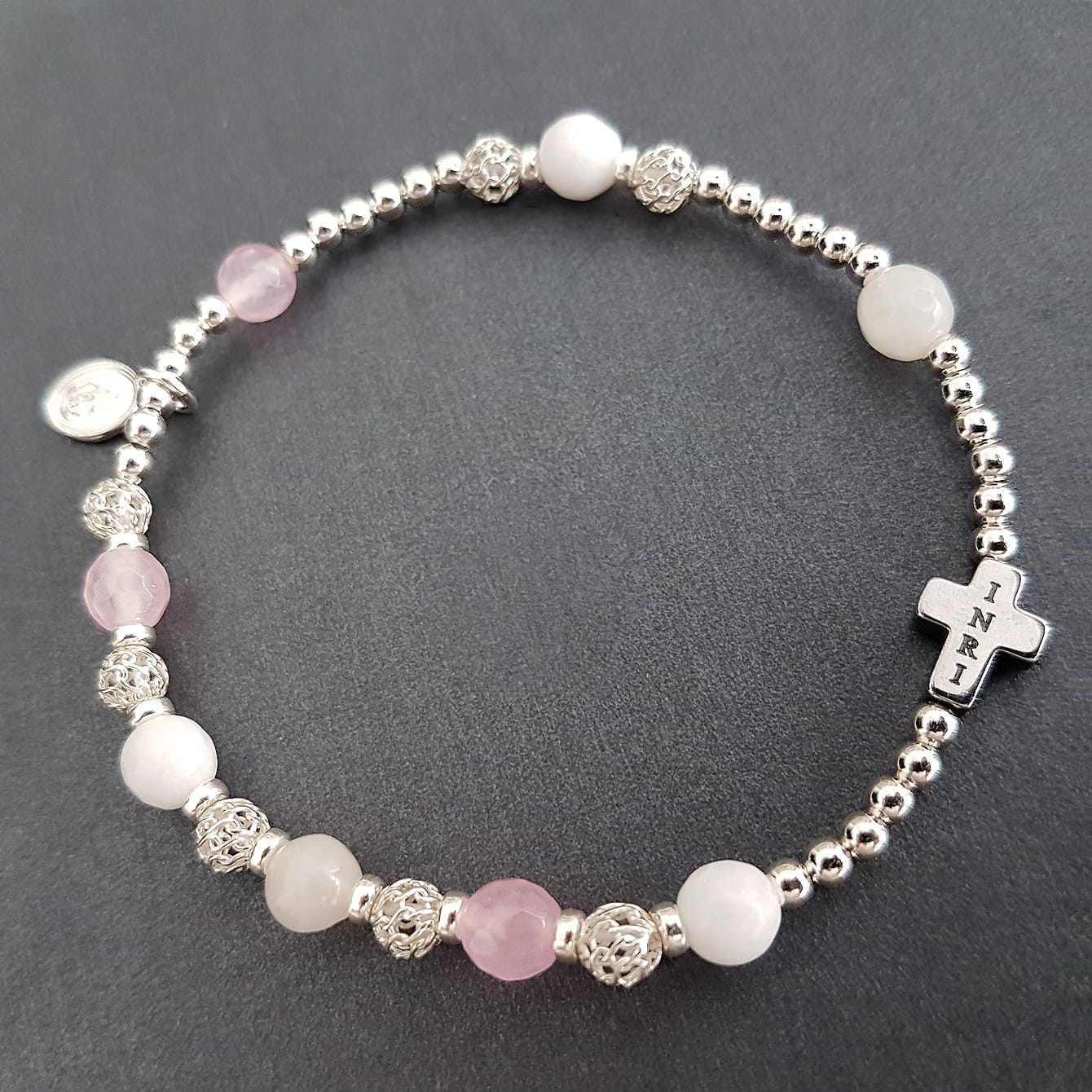 Materiał: Krzyż z hematytu w kolorze srebrnym (10x8 mm), kuleczki z hematytu w kolorze srebra 3mm,srebro próby 925 (bez domieszki niklu) (medalik, srebrne oponki, ażurowe kulki), kamienie z fasetowanego pastelowego jadeitu (6mm), gumka jubilerska.