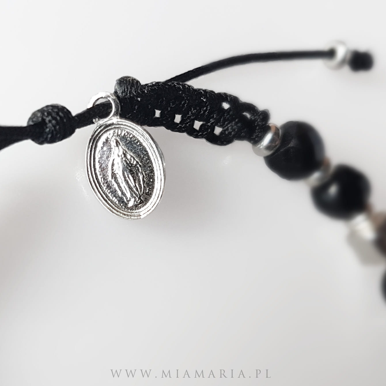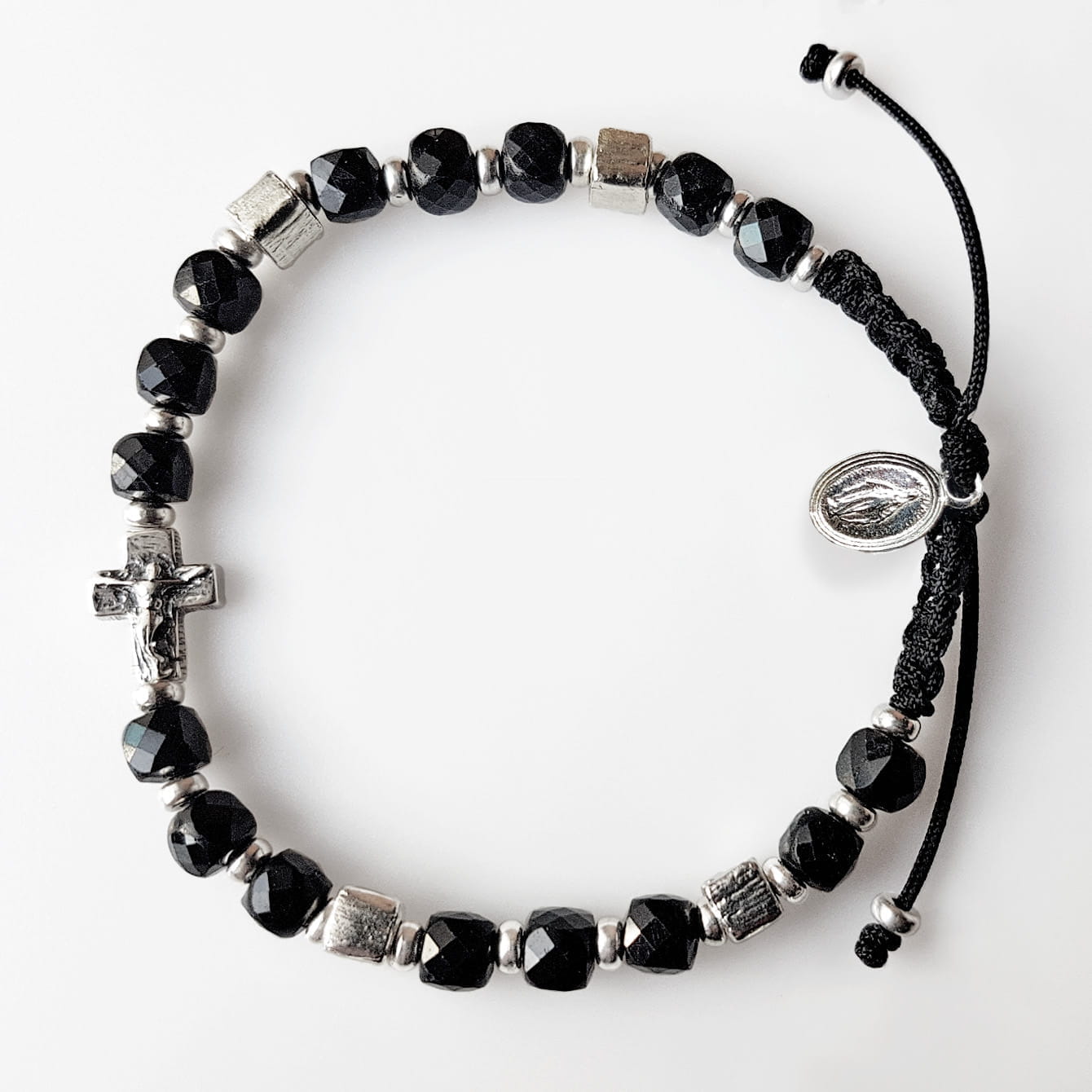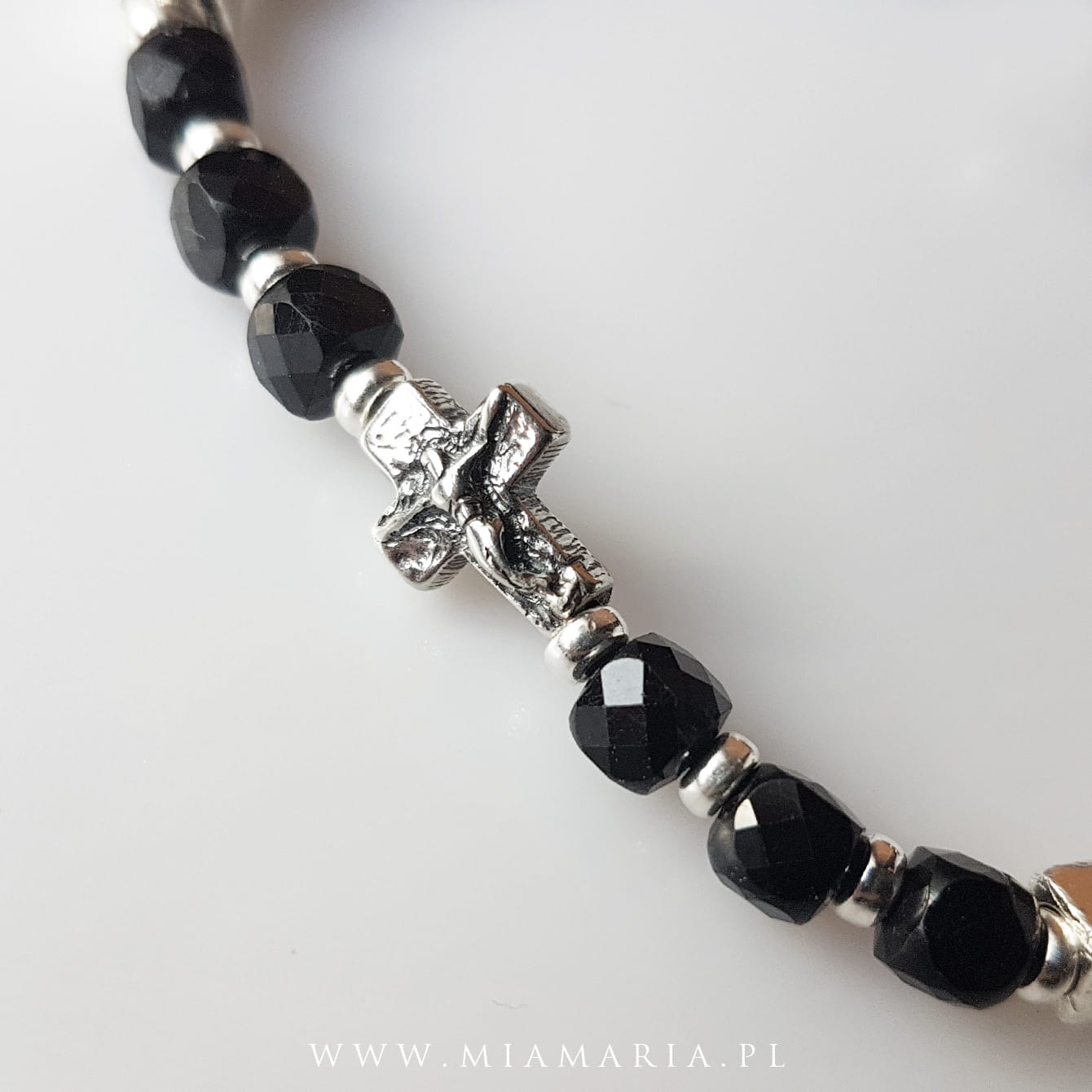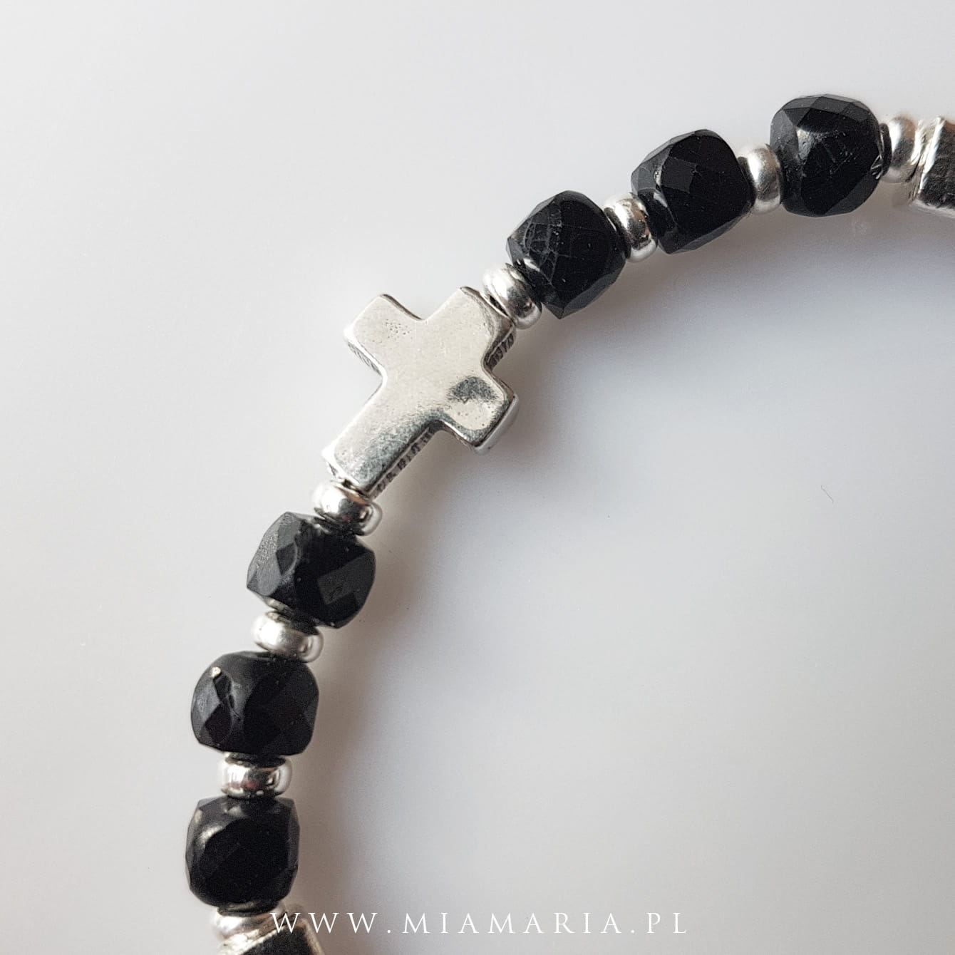 Srebro próby 925 (bez domieszki niklu) (Krzyż 10x8x3 mm, kostki 4 mm, Cudowny Medalik, oponki 3 mm), kamienie fasetowanego spinelu o średnicy 4 mm, sznurek jubilerski.