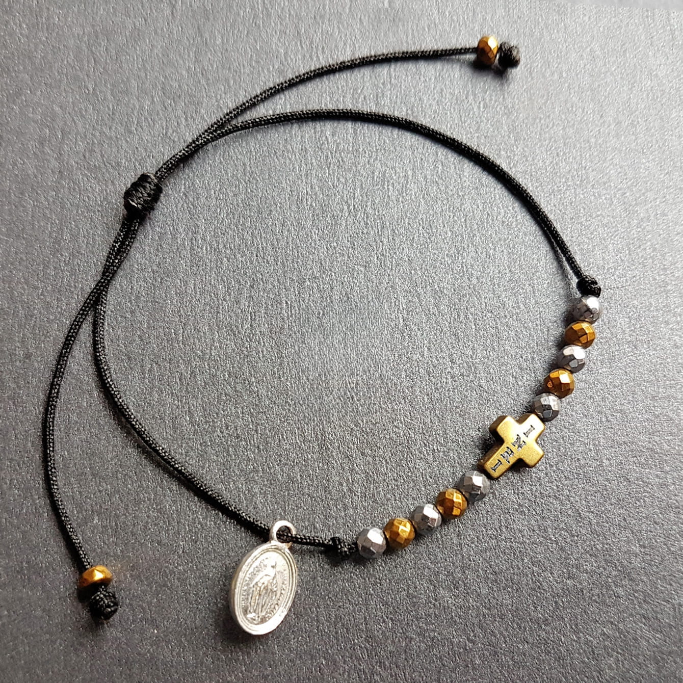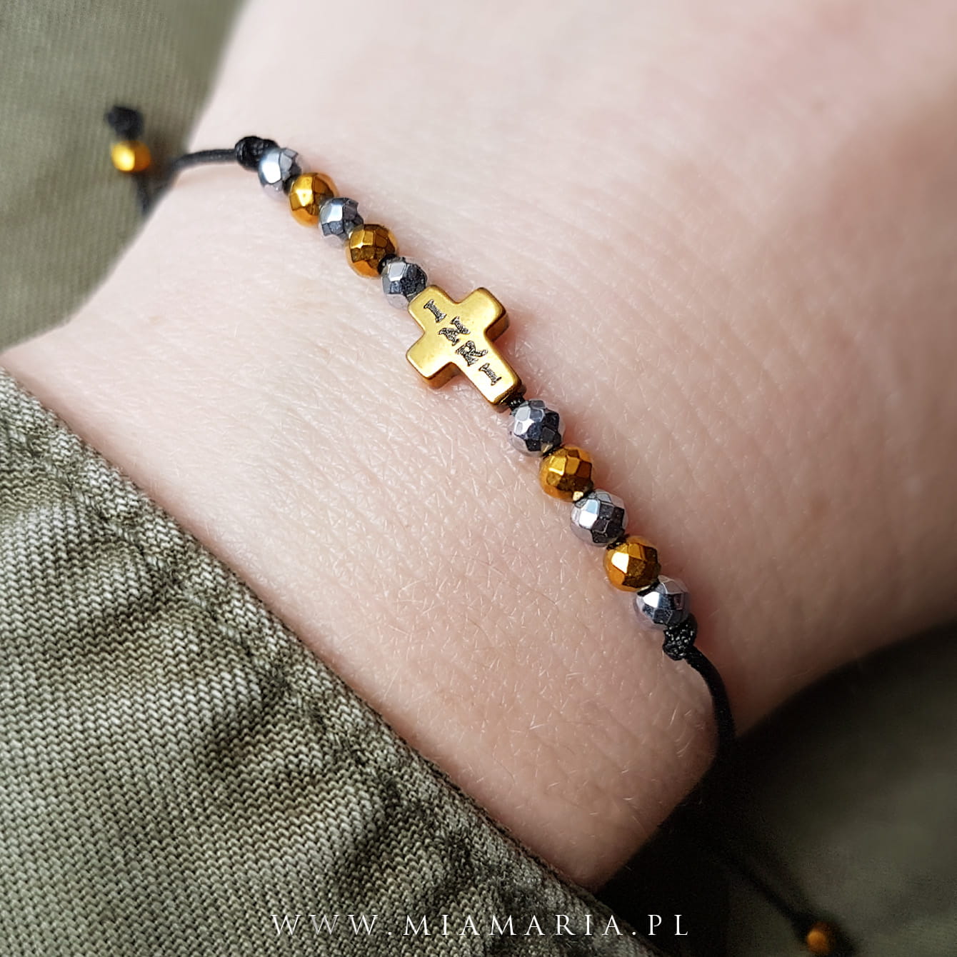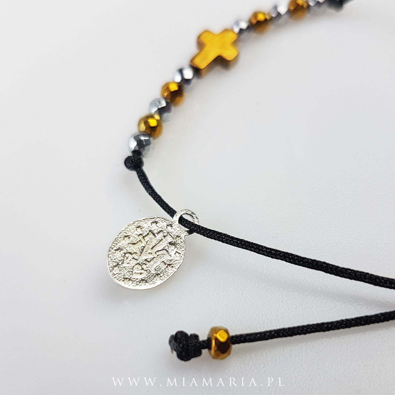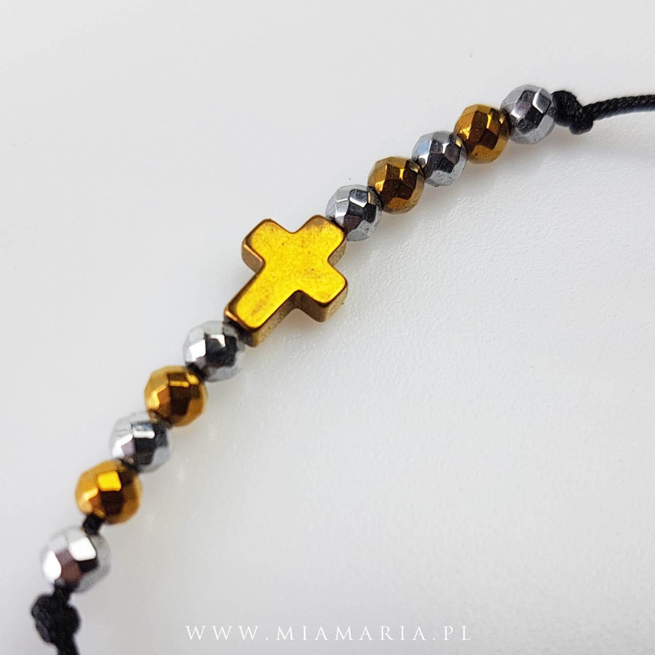 Srebro próby 925 (bez domieszki niklu) (Cudowny Medalik), hematyt złoty (Krzyż 6x8x3mm), fasetowany hematyt 4mm.