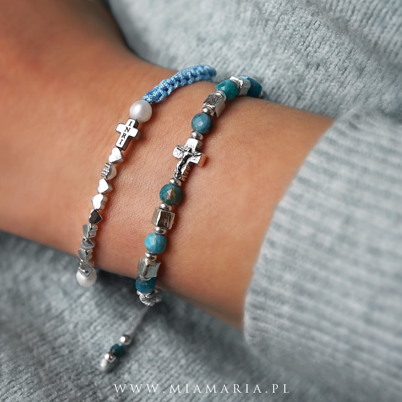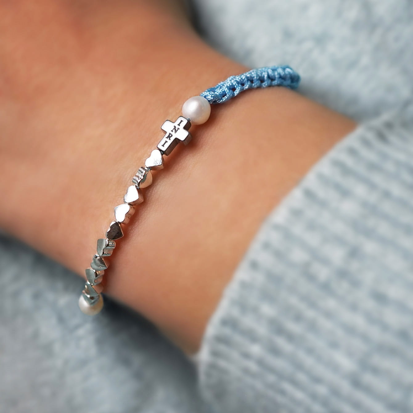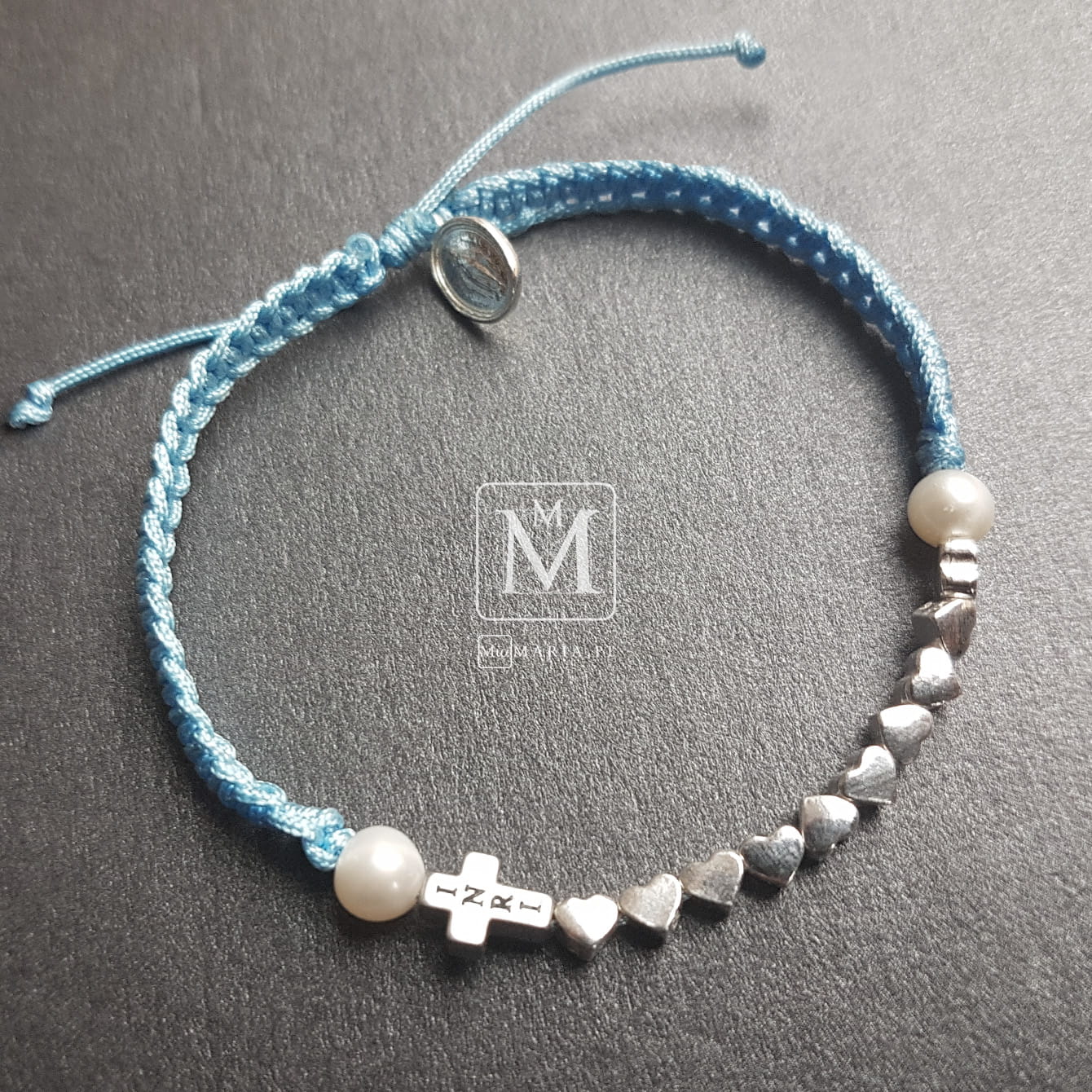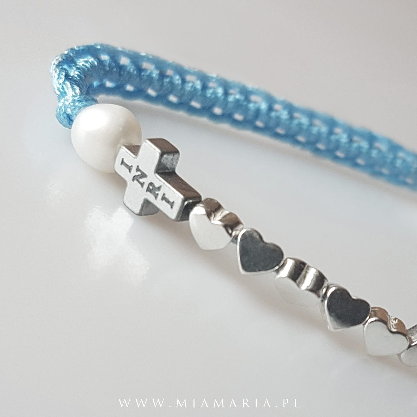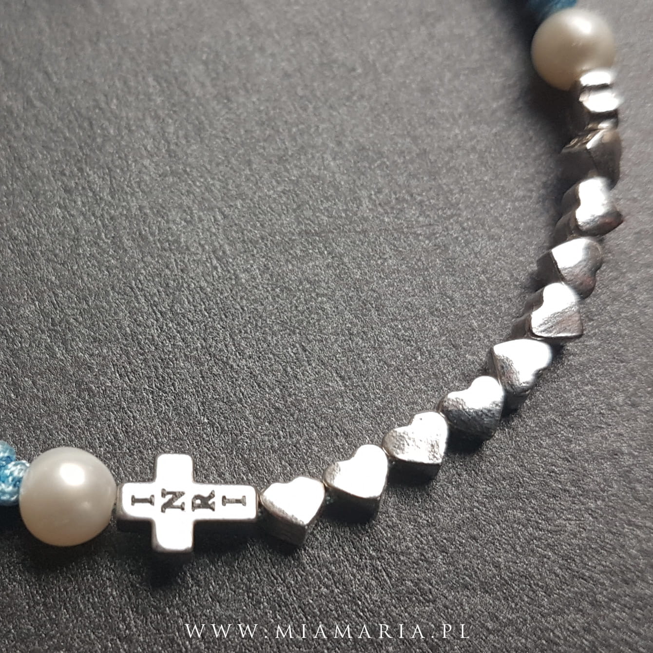 Srebro próby 925 (bez domieszki niklu) (Cudowny Medalik, serduszka), hematyt srebrny (Krzyż 8x6x3 mm), dwie perły rzeczne, sznurek jubilerski 0,7 mm.