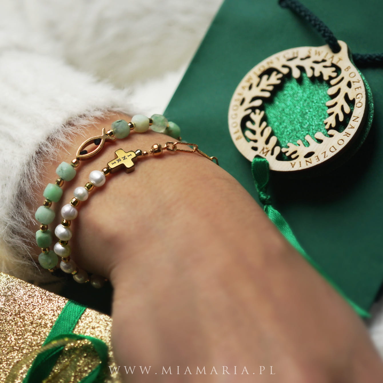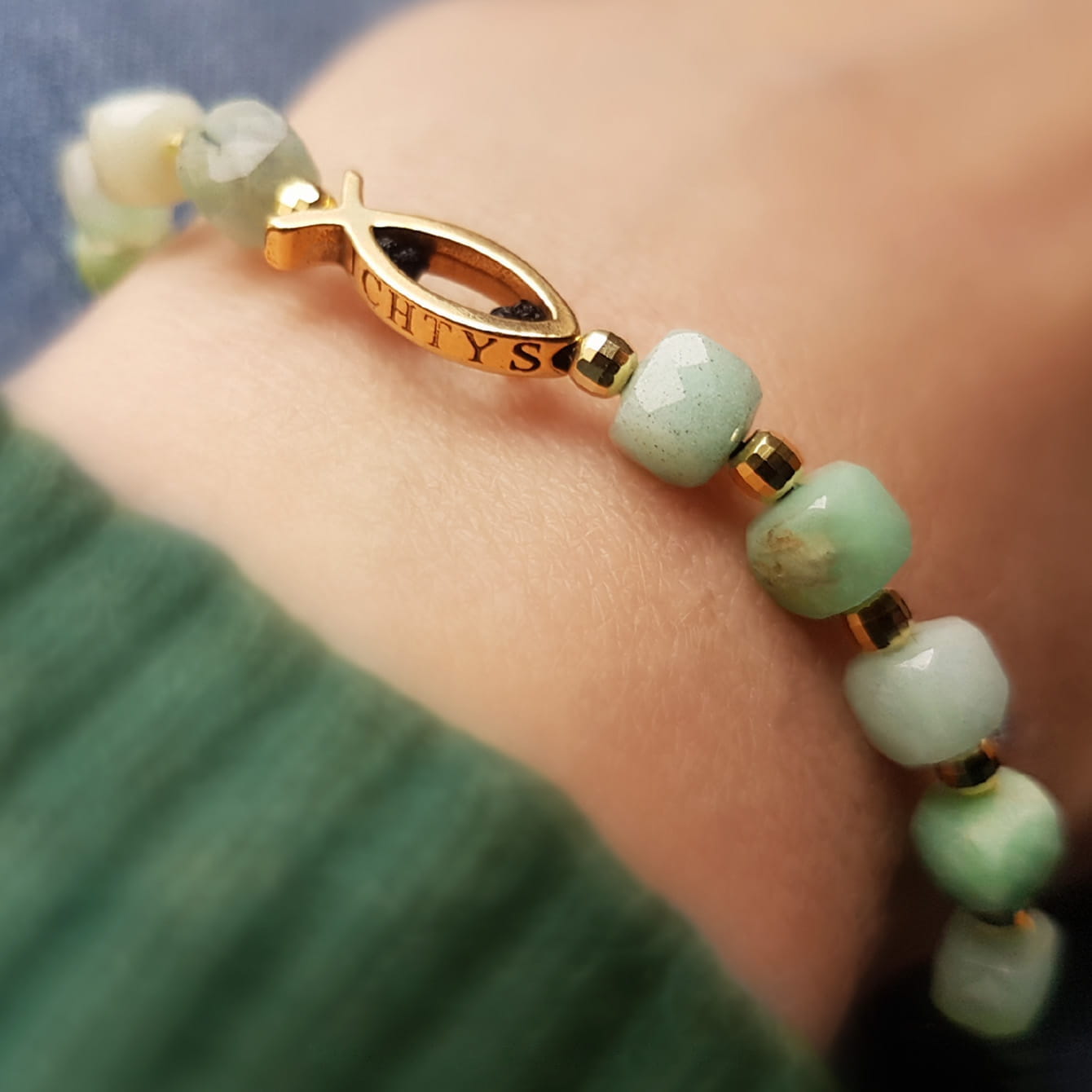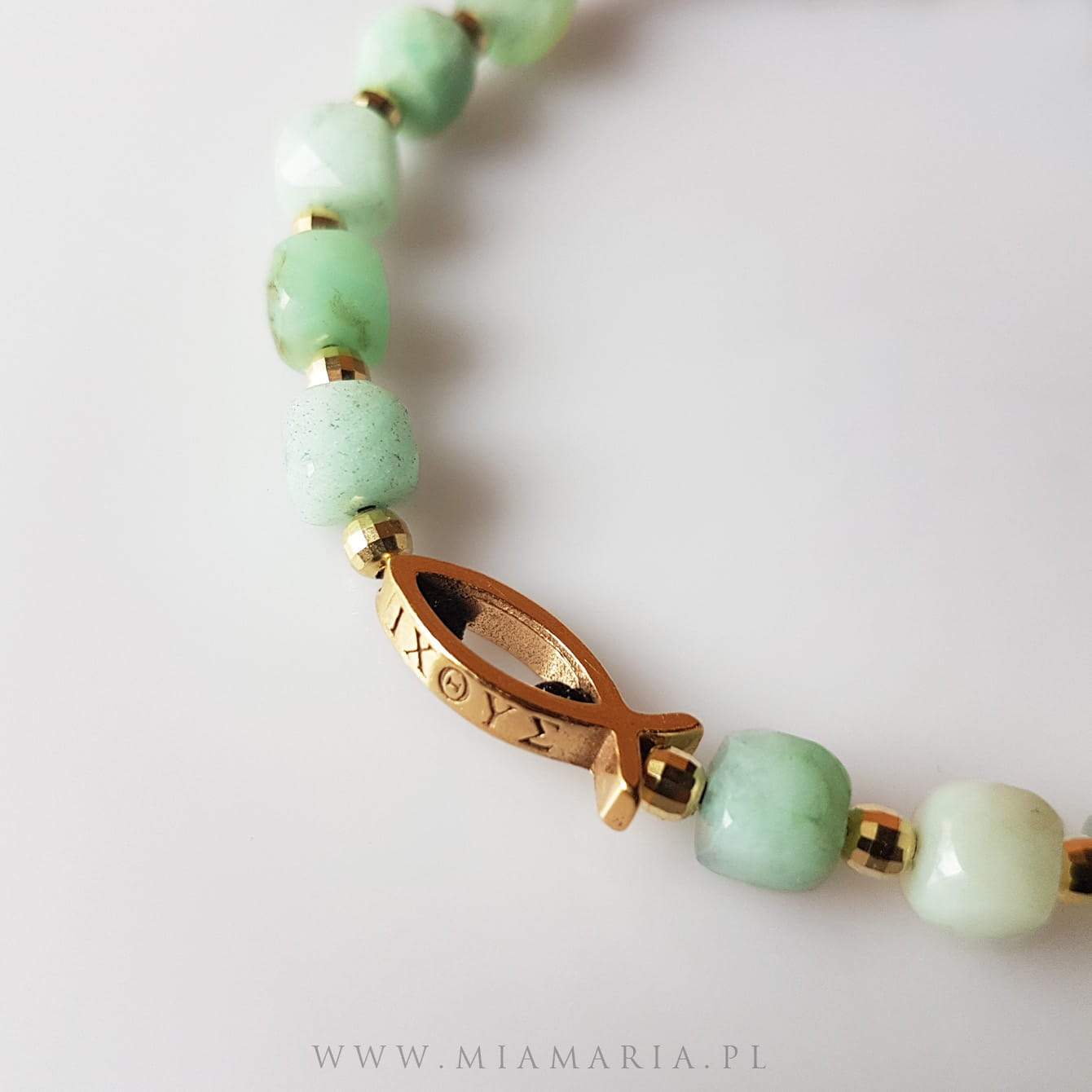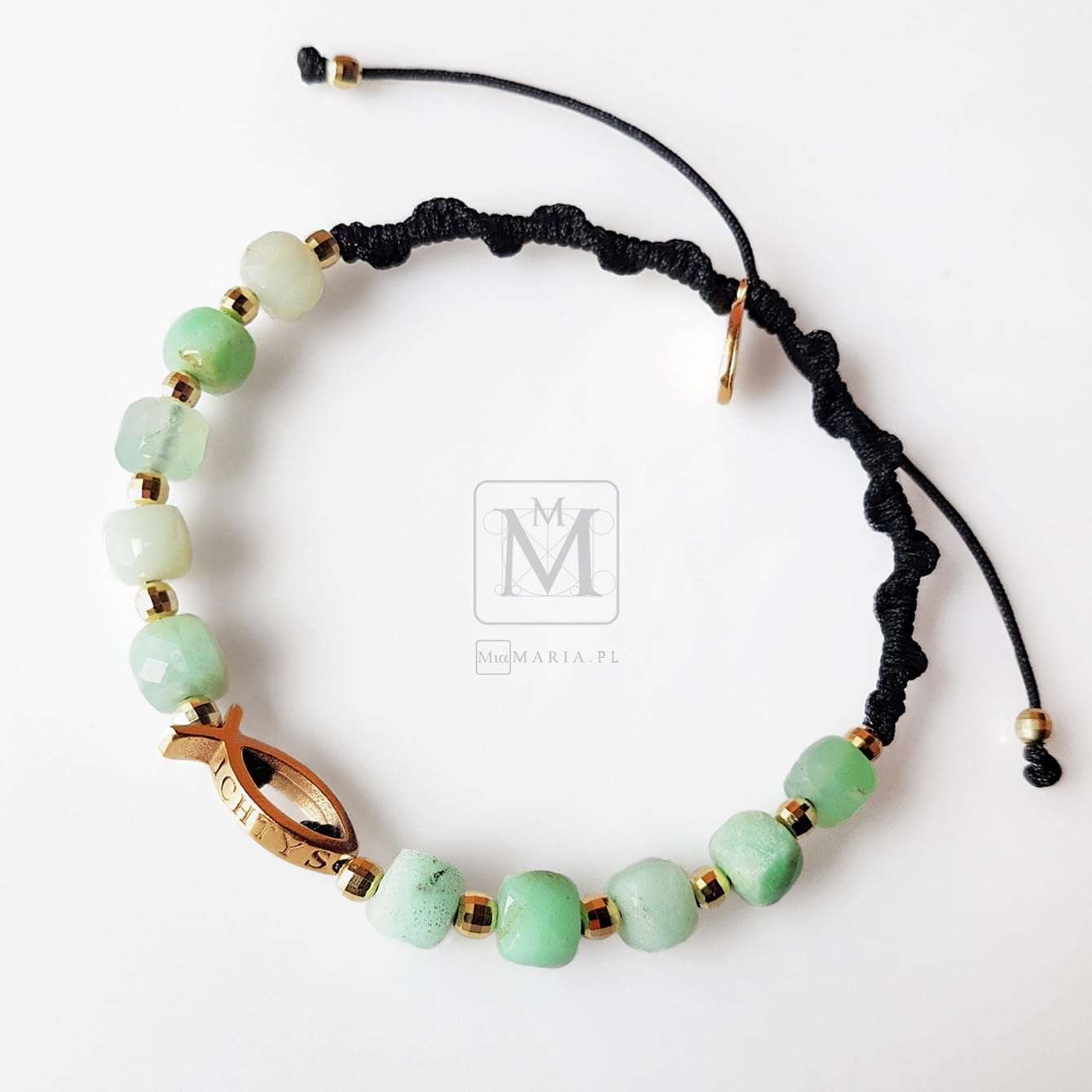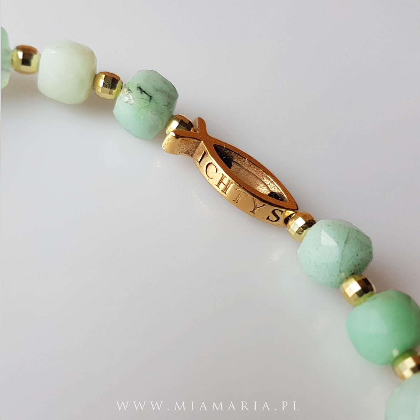 Pozłacane srebro najwyższej próby 925 (bez domieszki niklu) (Ryba 15x5,5x2,5mm; przekładki; Cudowny Medalik), chryzopraz w odcieniach zieleni (obłe kostki 5x5mm) z i bardzo trwały sznurek jubilerski.