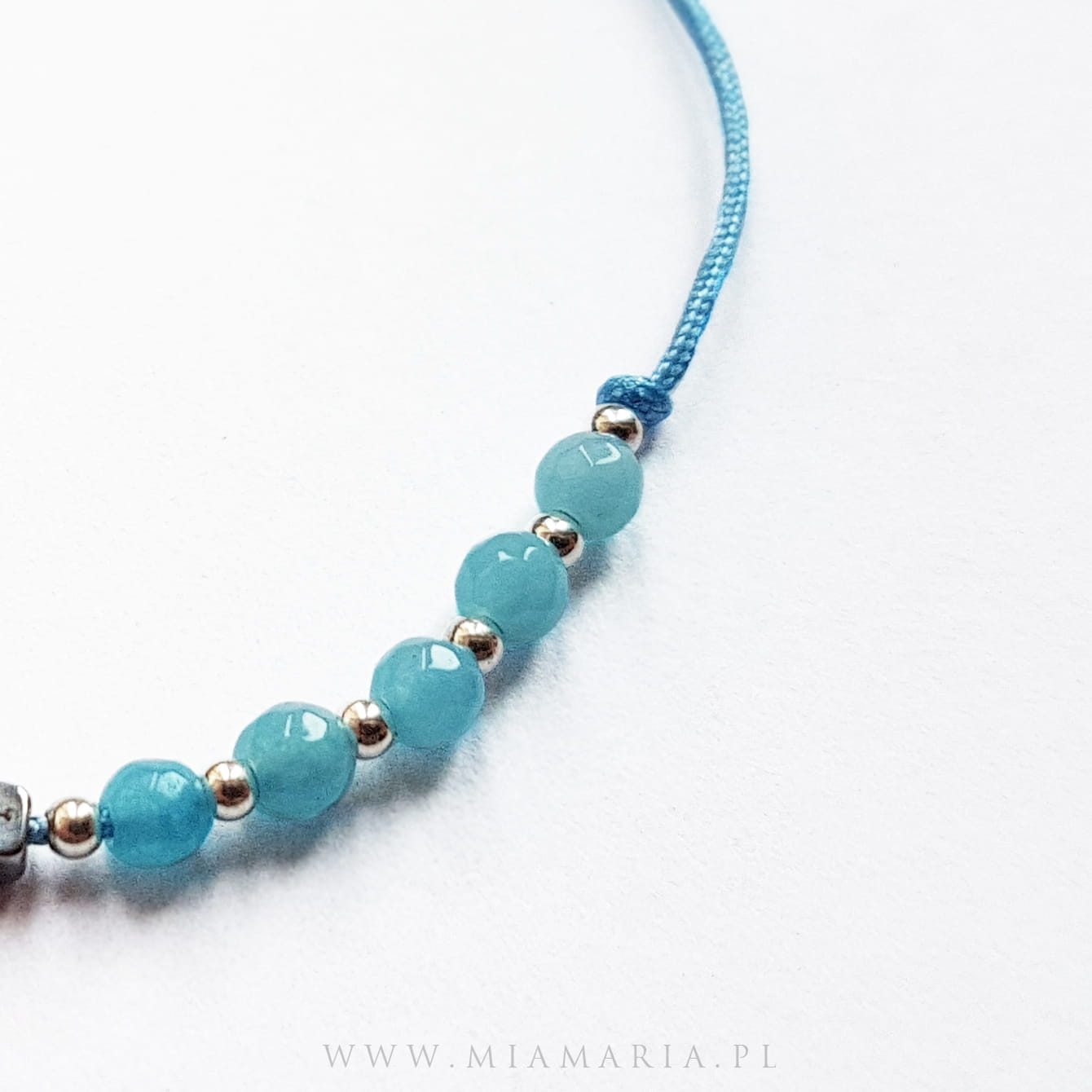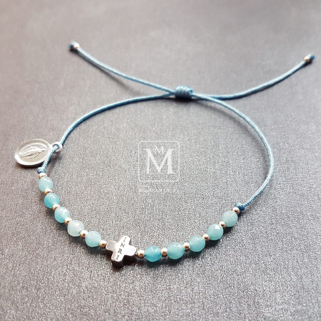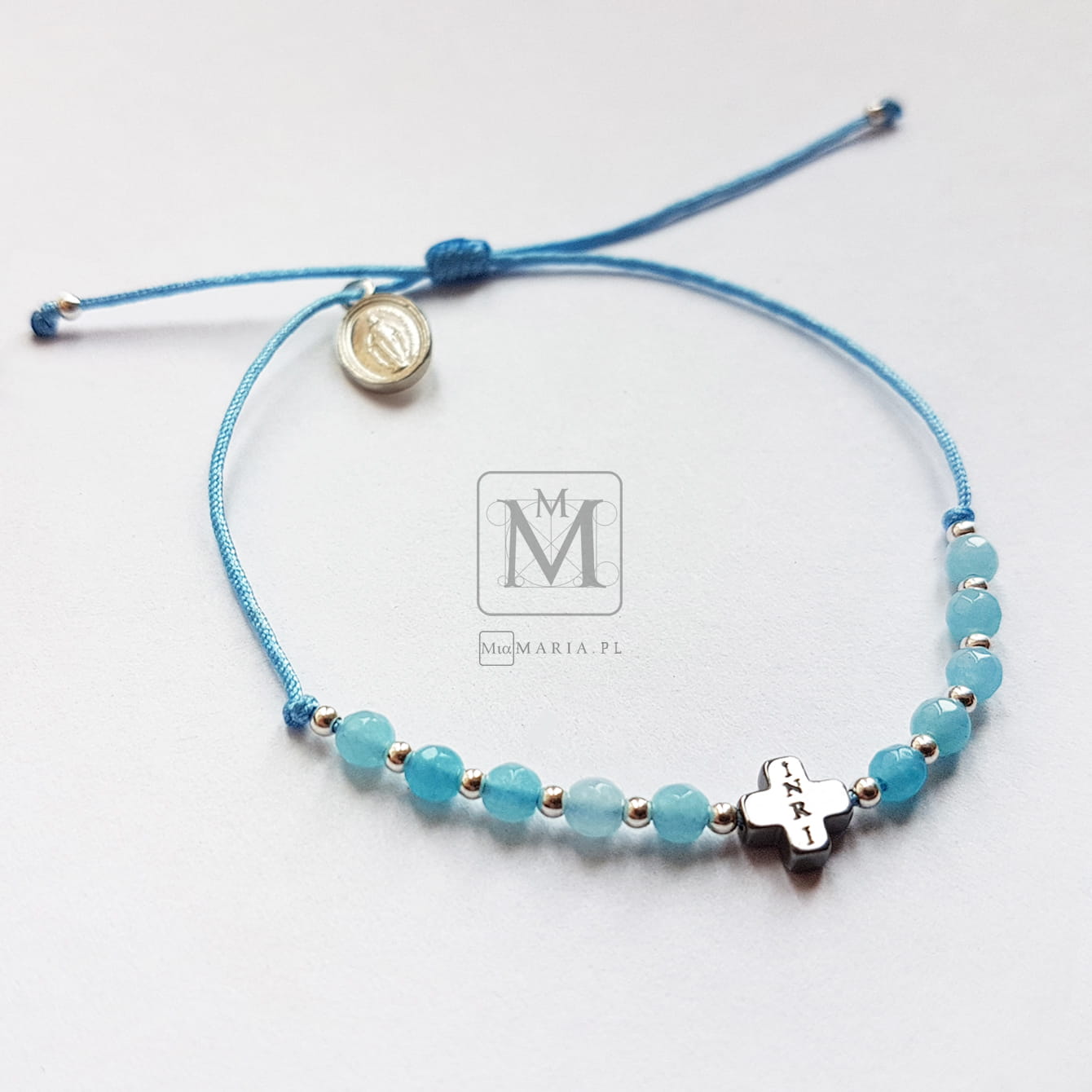 Materiał: Srebro próby 925 (bez domieszki niklu) (Cudowny Medalik, przekładki), hematyt srebrny (krzyżyk 60x60mm), kamienie zielonego, fasetowanego jadeitu (3mm) i sznurek jubilerski (0,7cm).