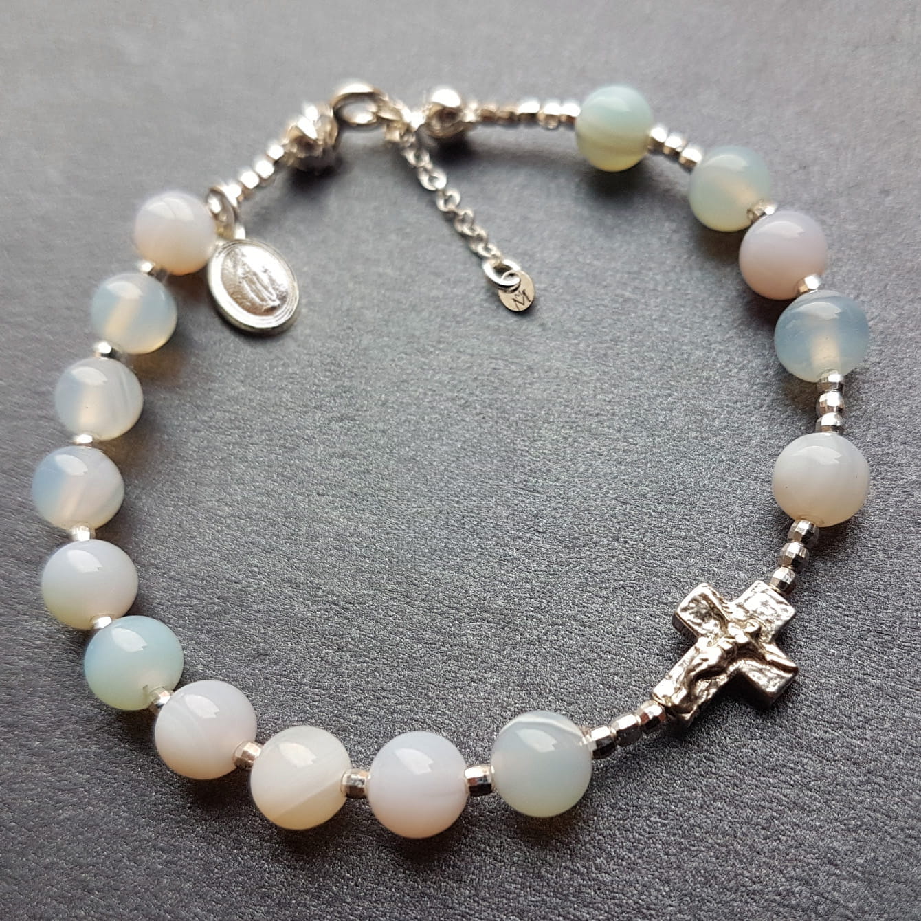 Srebro próby 925 (bez domieszki niklu) (Krzyż 10x8x3mm, Cudowny Medalik, łańcuszek i zapięcie), kamienie mieniącego się różnymi barwami jadeitu (6 mm), kulki fasetowane z hematytu 3 mm.