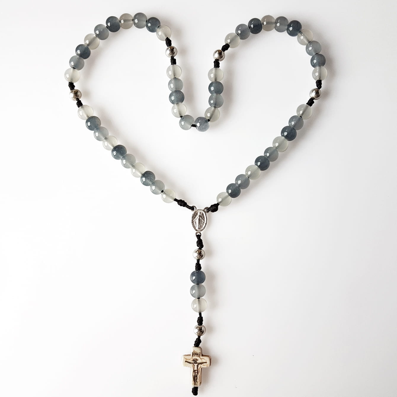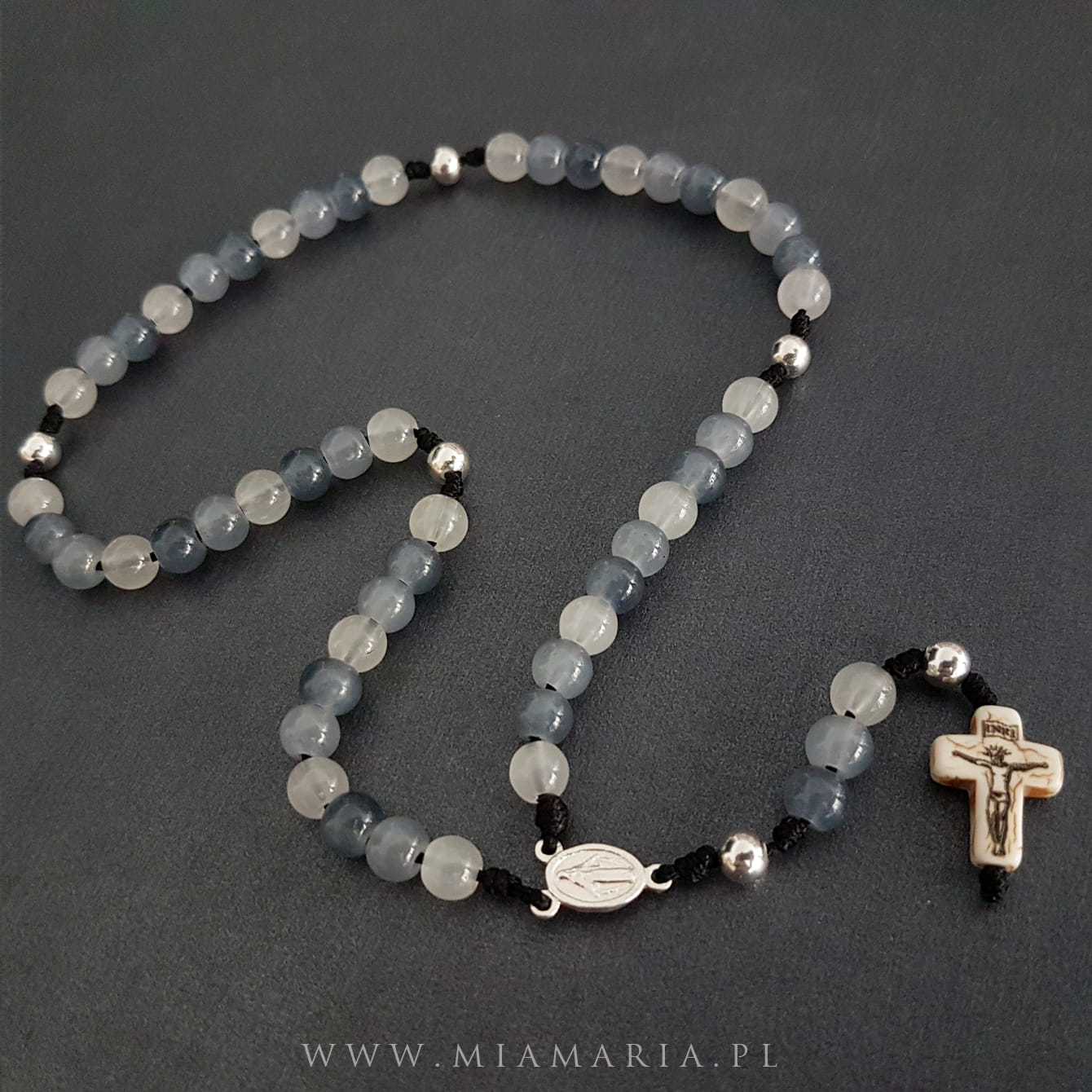 Materiał: Srebro próby 925 (bez domieszki niklu) (kulki, Cudowny Medalik), krzyżyk z naturalnego kamienia howlitu (15x12x3mm), kamienie jadeitu w szarych odcieniach (6mm).